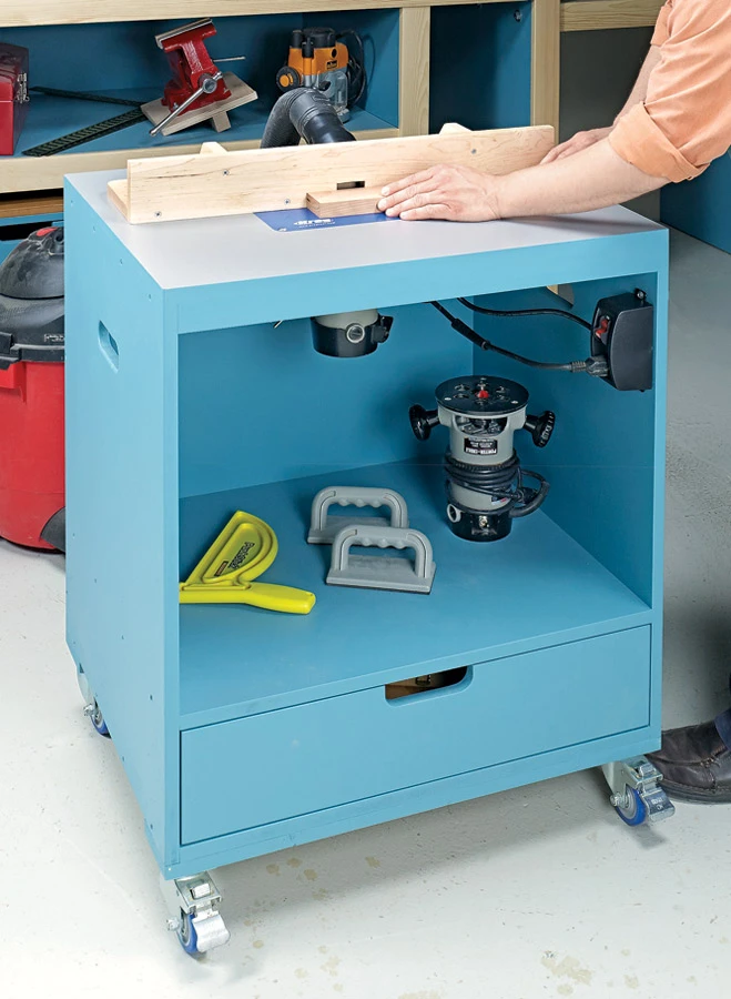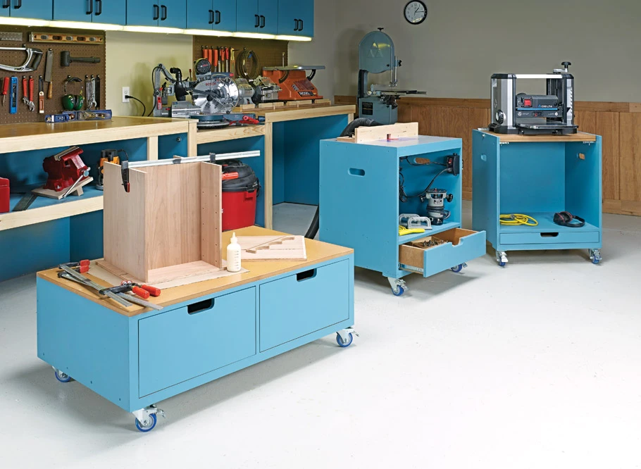 In a nutshell, setting up a shop is all about creating a space to build projects. That requires solid worksurfaces and ample storage. Equally important is making a home for tools and projects in-progress. These three carts fit that role to a “T.” To save space, the carts can roll under a workbench or workstation which would them make great additions to just about any shop. The assembly cart, router table, and flip-top cart all share the same construction DNA, which streamlines the building process. This means you can build them quickly and then get to work on your next project.