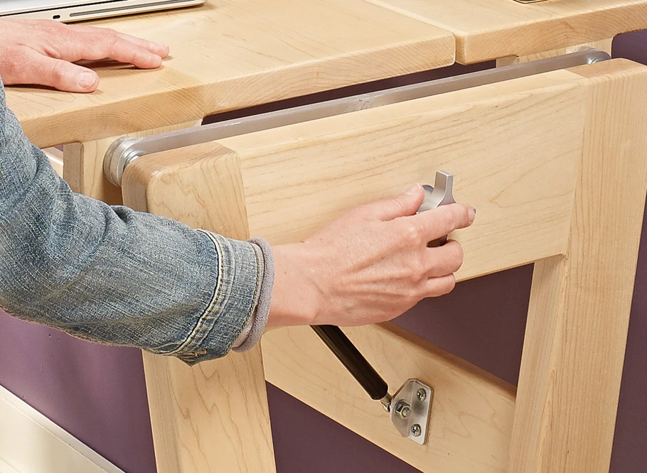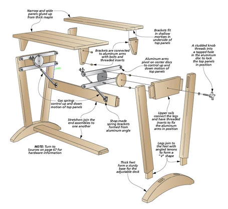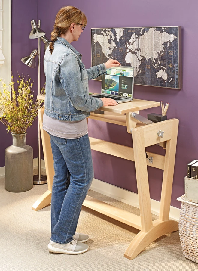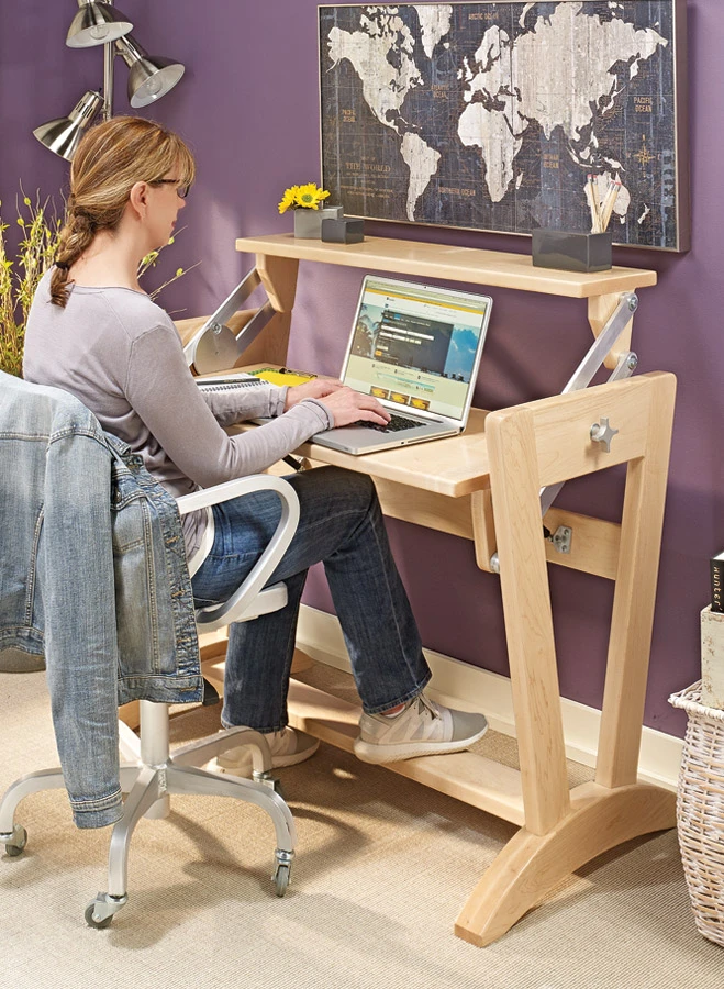 Standing desks are increasingly popular these days, mainly due to concerns about fitness, as well as the back problems related to sitting all day. But there’s something nice and familiar about a desk you can sit at from time to time, as well. This innovative, adjustable desk offers the best of both worlds. The top is formed from two glued-up, solid-wood panels that are connected to one another with aluminum arms mounted to a center pivot point. The panels can be adjusted in relation to one another much like a seesaw: When one goes up, the other goes down. This unique design allows you to raise the front panel to create a standing desk, or lower it to a standard desk height for sitting. And since people are all different heights, the desk position is infinitely adjustable between the high and low settings. Gas springs beneath the desk control the pivoting action for smooth operation.