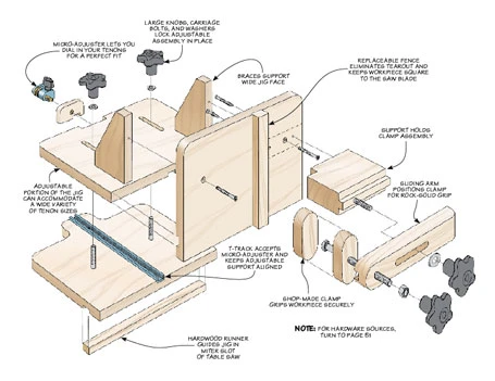 A strong mortise and tenon joint depends on a snug-fitting tenon with smooth glue surfaces. The trouble is, tenons cut with a dado blade or a band saw require a little further work to attain a smooth face. But with this jig, you can cut ready-to-glue tenons. The fence and integrated clamp combine to give a rock-solid grip on the workpiece. And the micro-adjuster allows you to dial in the cut for a perfect fit.