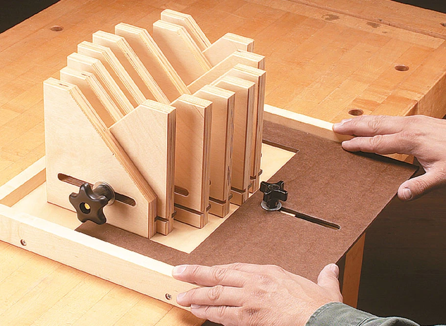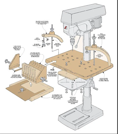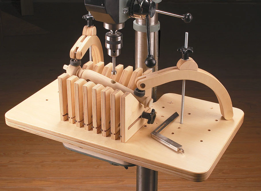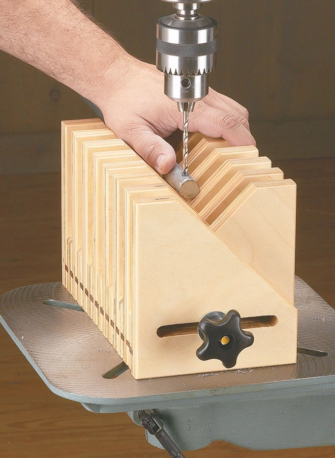 If you’ve ever tried to drill a hole in a dowel or oddshaped object (like a turned leg), you probably know how frustrating a job it can be. It’s a real challenge to hold these kinds of workpieces steady and accurately on the flat table of a drill press. And it’s even trickier if you have to drill an angled hole. Usually, I wind up cobbling together some jury-rigged device to support the workpiece in question. But since building this adjustable V-block system, that’s no longer a problem.
