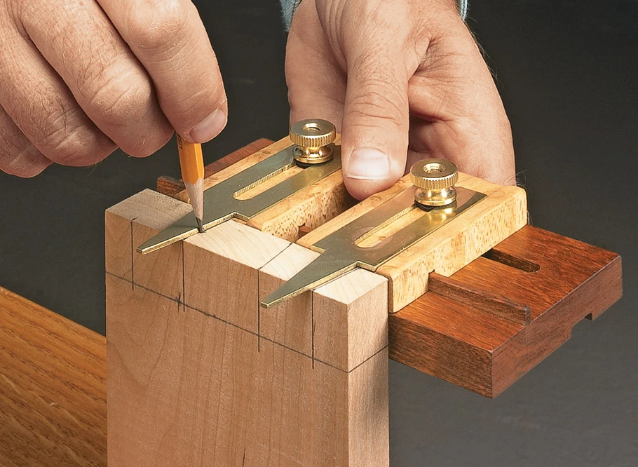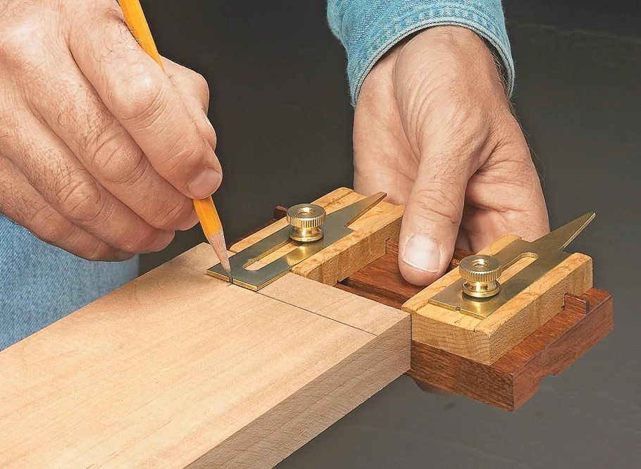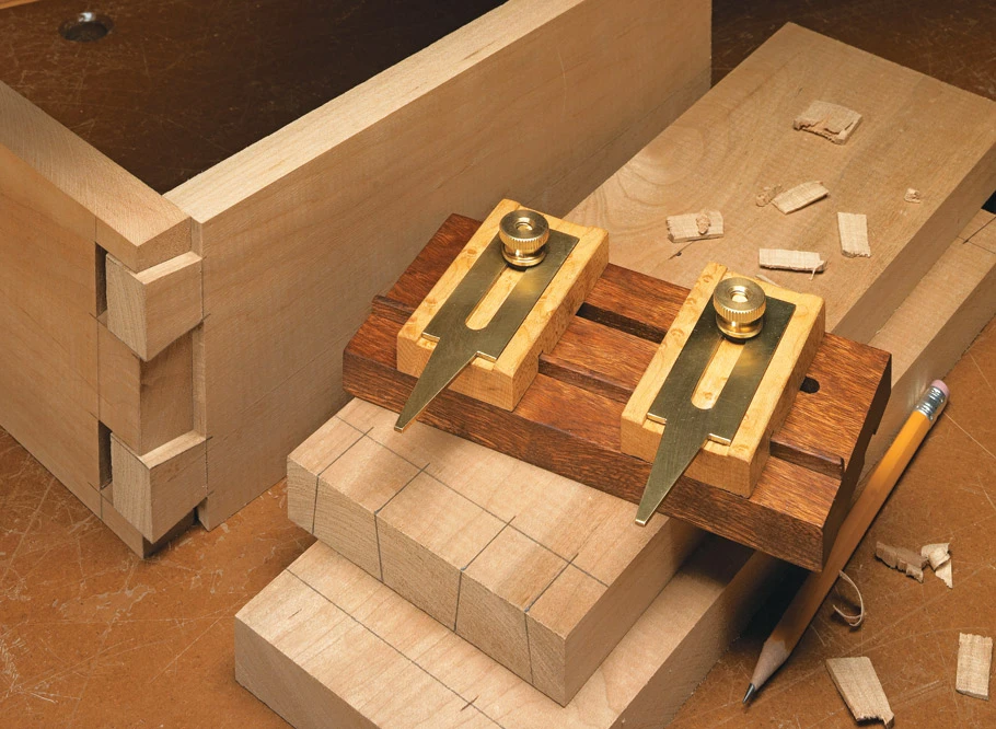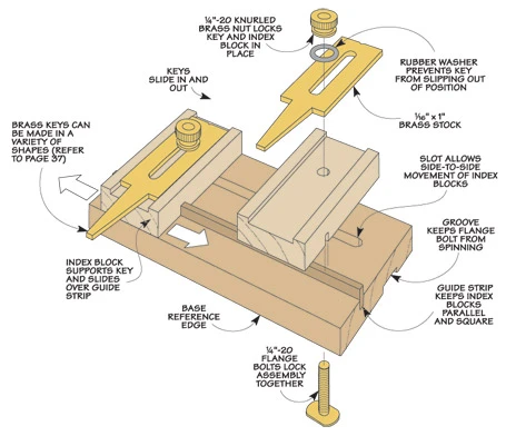 When you first look at the photos, you might think this is a basic dovetail layout tool. But looks can be deceiving. There’s a lot more to it than that. You’ll found other uses around the shop for this handy tool, like laying out mortises. The nice thing about building this tool is that you can put it together in an afternoon or weekend. If you look at the drawings on the next page, you’ll see what I mean. The wood pieces are small, so it’s a good opportunity to use some exotic or special wood without worrying about breaking the bank.