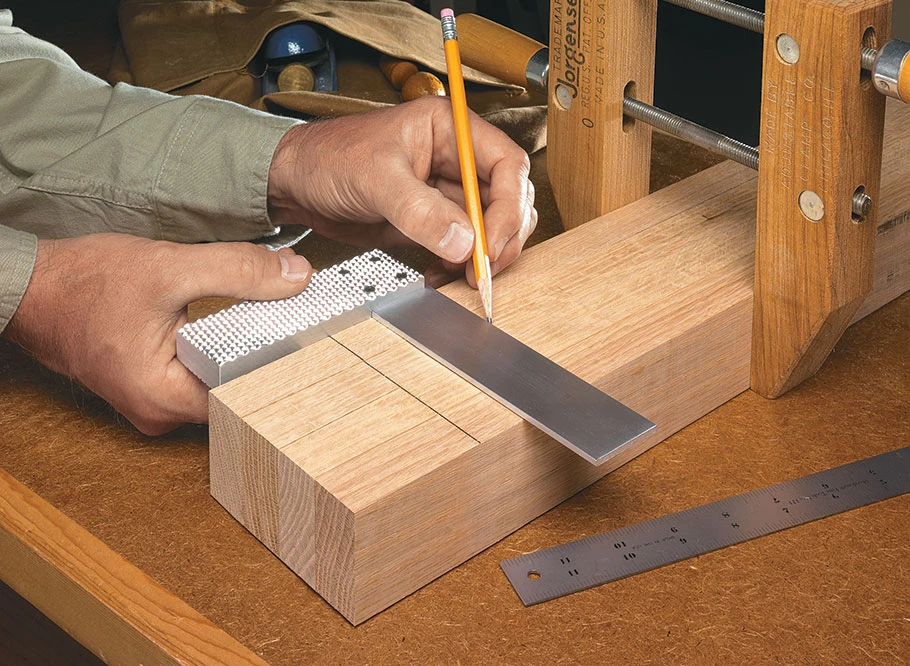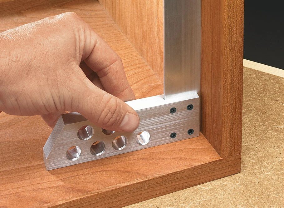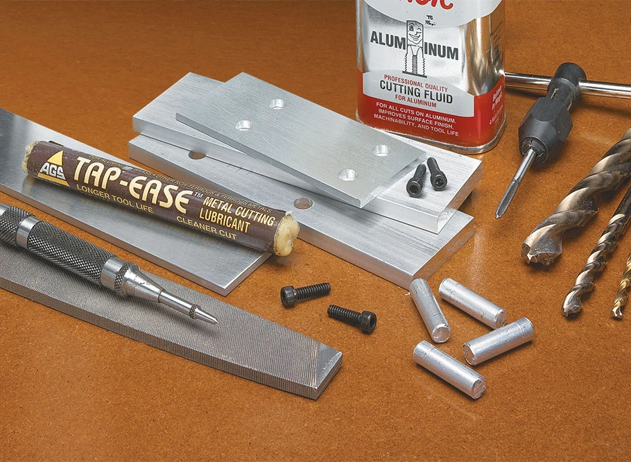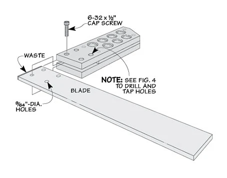 A good square is one tool that’s indispensable in the shop. I use it on just about every project I build. But some squares aren’t all that accurate. That’s why I like the design of the squares. Not only can you customize them to your liking, but they’re adjustable. If they should ever lose their accuracy, there’s an easy fix. Four cap screws hold the blade securely to the handle of the square. If the blade ever gets knocked out of square, you can loosen the screws, adjust it back to 90°, and then retighten the screws. The really nice thing about these squares is they’re easy to build with common shop tools. In a nutshell, you’ll take readily available aluminum bar stock and laminate it to form the handle, as shown at left. Finally, after attaching the blade and adjusting it, you’re ready to put the square to use in your shop.