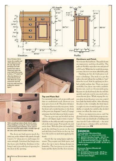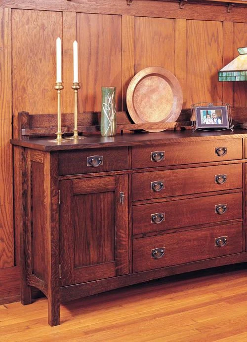 An Arts and Crafts sideboard built during the period would be much too big for most homes today. Here is a scaled down version that is more appropriate for a modern home. You’ll get complete plans, dimensioned drawings and instructions for this piece, as well as the part numbers and sources for all hardware.