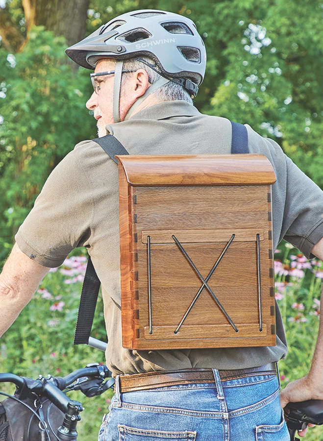 Like me, you may think that a wood backpack is an odd choice for a project — at first. Clunky, heavy, uncomfortable. But an examination of the details of this backpack (and the companion satchel) reveal a clever exploration of the wonder of woodworking design and thoughtful construction. There was a time when a lot of the functional objects that surround us were made from wood, from utensils to furniture to shipping crates. The backpack and satchel call to mind the travel trunks, valises, and campaign furniture of the 19th century. But this isn’t a strict steamship reproduction. Those pieces have an over-the-top grandeur. The look here is updated — clean, crisp, and better suited for bikes and cars. The shared DNA is that the construction has to be both light and rugged. For the material, we used straight grained walnut. It’s a mid-weight hardwood that is plenty strong. The pieces are assembled with box joints. This adds a graphic visual element to go along with large glue surfaces. In keeping with the pared-down look, the hinge hardware for the lid is minimal. Purchased shoulder straps and stretch cord can be added to suit your style. With just a little work, you’ll soon be ready to head out with a unique piece that’s sure to draw attention.