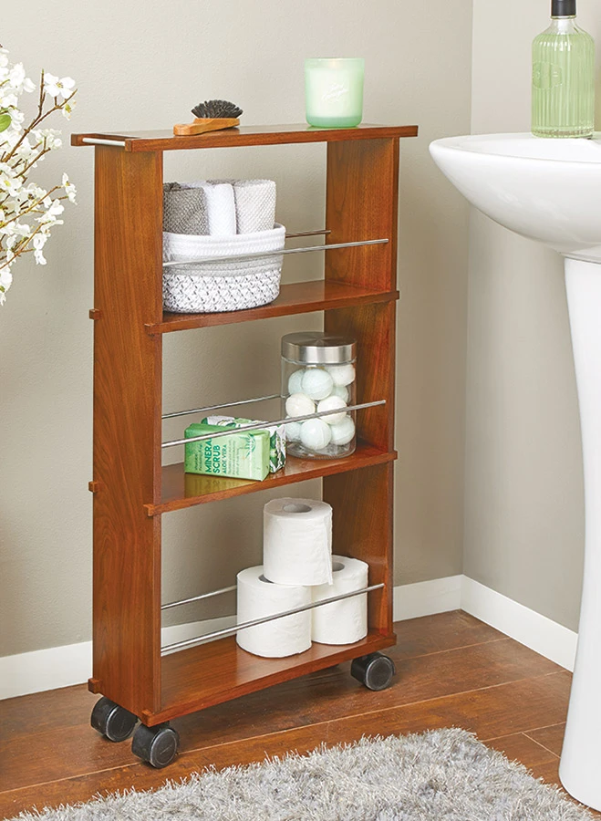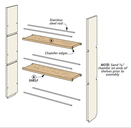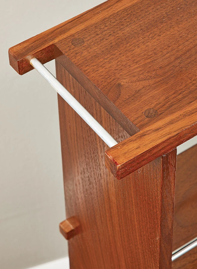 these types of items is usually lacking. And it was that need for storage that led us to the storage cart you see here. This cart features three shelves that pack in storage that’s easily accessible. A pair of stainless steel rods guard each shelf to keep the items in place if you roll the cart around. The top of the cart not only acts like a shelf as well, but it also features two small stainless steel rods that do double duty — they can serve as handles to move the cart, or the perfect place to fold up and hang a small hand towel. The cart itself is small, compact, and perfectly sized to slip between a pedestal sink and the wall. But, don’t let its size fool you. It’s a fun build that packs in some great woodworking that you can take with you and apply to other projects. So, let’s head to the shop and get started.