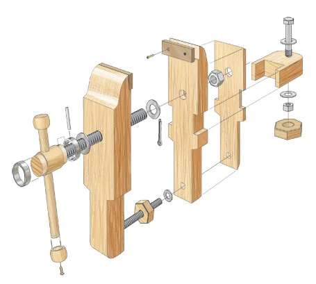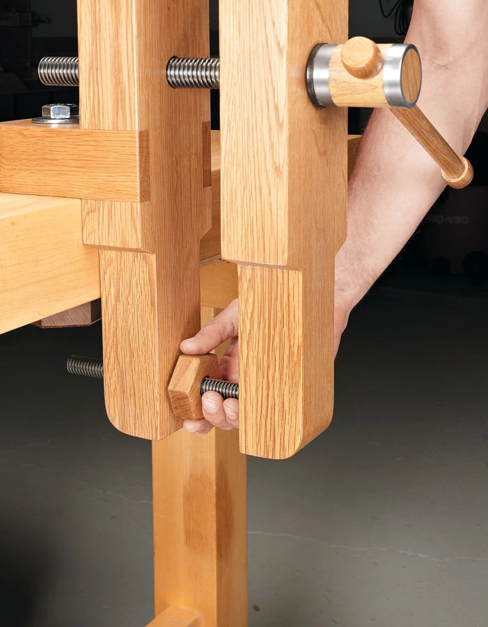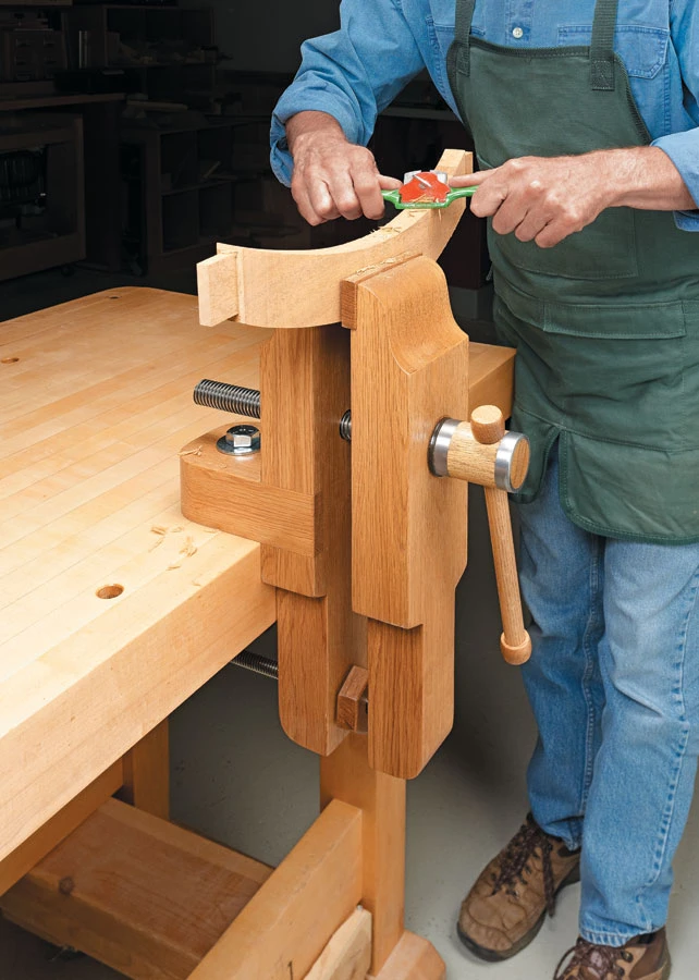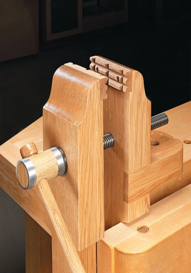The design is based on a traditional style of vise once common in Europe. Stout hardwood jaws and rugged Acme threaded rods deliver all the clamping force of a standard vise but in a compact package. The narrow, profiled jaws let you work on a piece from a variety of angles. Perhaps best of all, the vise is elevated so it’s a real back-saver. The plan provides three ways to attach it to just about any worksurface or bench.