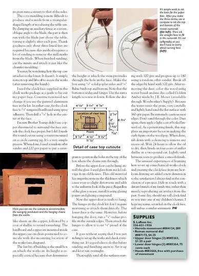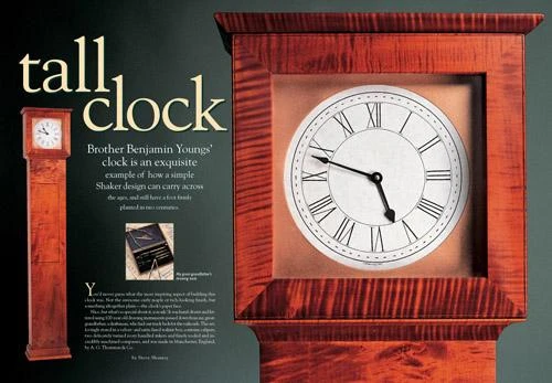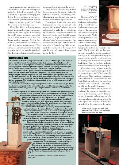 The clock is made from curly maple and is colored with a red dye. The face is hand-lettered, which is covered in the instruction.