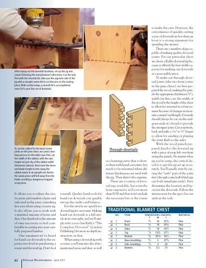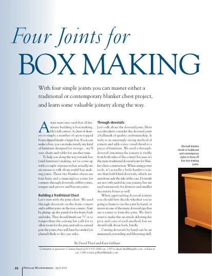 Learn to make through-dovetails, rabbets, biscuit joints and tongue-and-groove joints with David Thiel and Kara Gebhart. In this project download, you will develop these essential skills while making a blanket chest. Step-by-step instructions, photos and a complete cut list are provided. You’ll be proud of the finished piece and your new skills.