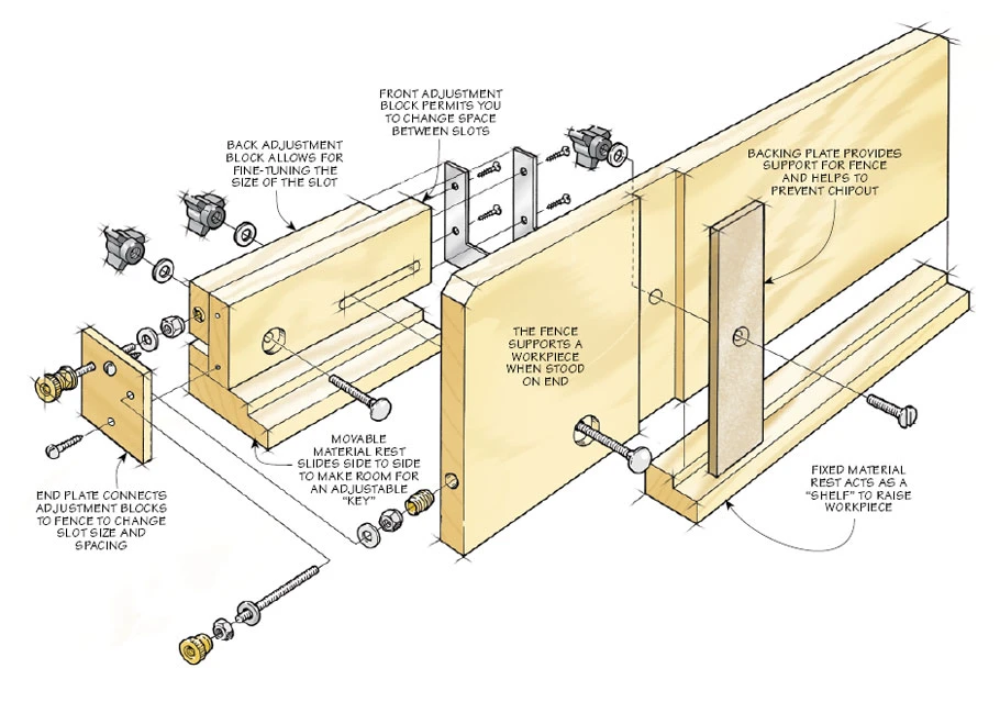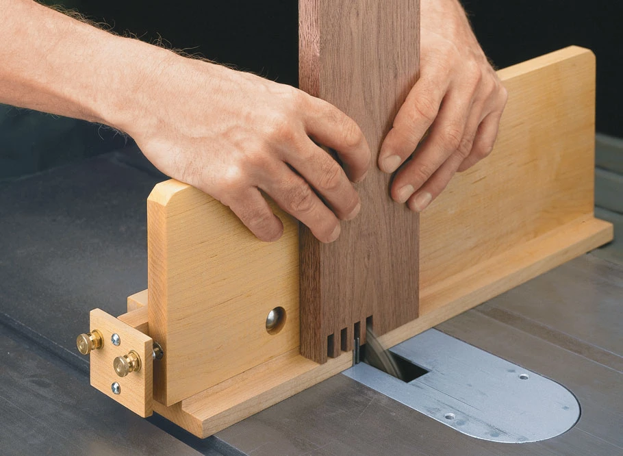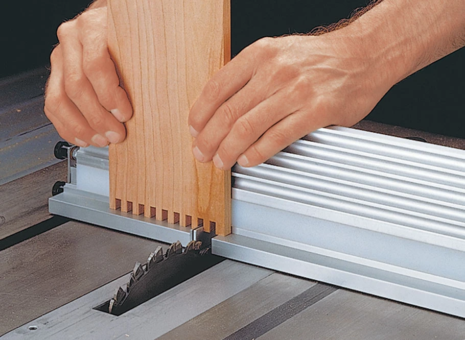 The most impressive thing about this box joint jig isn’t the tight-fitting joints you can make with it. After all, that’s what you expect from a precision made jig. What’s really unique is how quickly and easily it can be adjusted. Most box joint jigs require an almost endless amount of tweaking. This jig, on the other hand, can be set up in a matter of minutes. The secret is a built-in system that allows you to adjust both the size and spacing of the pins and slots that make up a box joint in extremely fine increments. By simply turning a knob, you can set the jig to cut slots that range in size from a width of 1/4″ to 13/16″. A second knob changes the spacing of the pins and slots. This tightens (or loosens) the joint, which allows you to sneak up on a perfect fit. The result is perfect-fitting box joints every time.