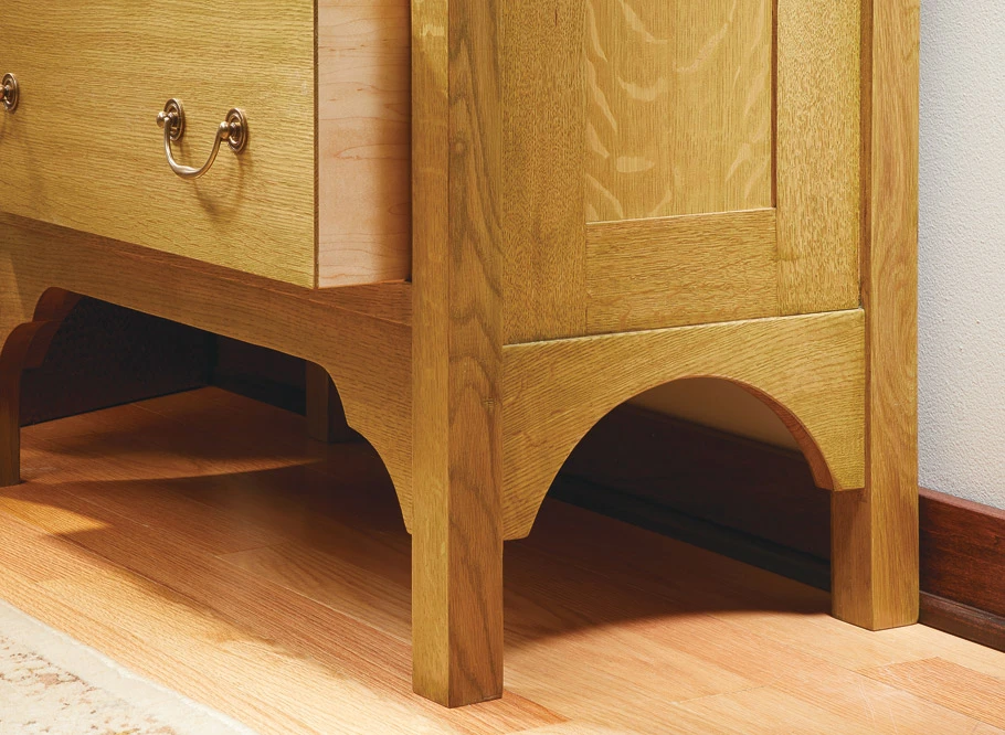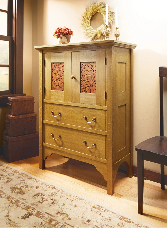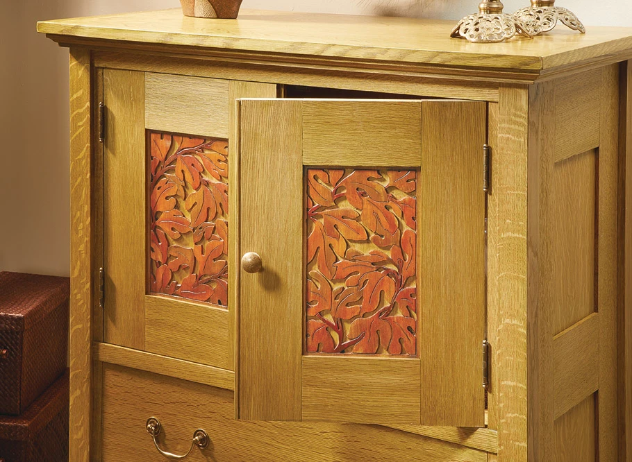 The first thing you’ll notice when you look at this project are the carved panels in the doors. While they may look complicated to create, don’t fear. You don’t need to be an artist or master carver to recreate the look seen here. A few simple steps and some watercolors are all that’s needed to bring these panels to life. The next thing you’ll notice is the green-tinted quartersawn white oak. A quick wash with a tinted-varnish will set the linen press apart from any piece of furniture you own, and it will stand out anywhere you put it.