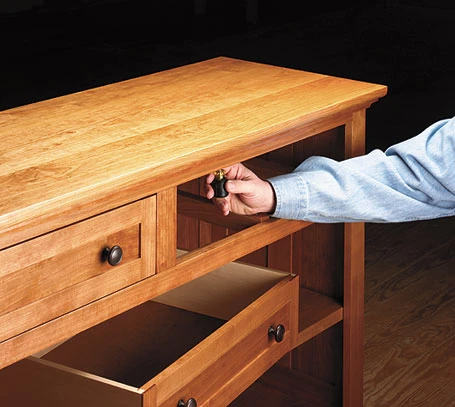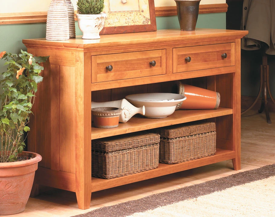 Straight, clean lines give this console a contemporary look. With its frame and panel assemblies, open shelves, and “framed” drawer fronts, there’s plenty of woodworking that goes into this project. But the construction isn’t complicated at all. Three frame and panel assemblies form the ends and back of the case. Then a face frame and a bottom panel are added with simple pocket-hole joinery.