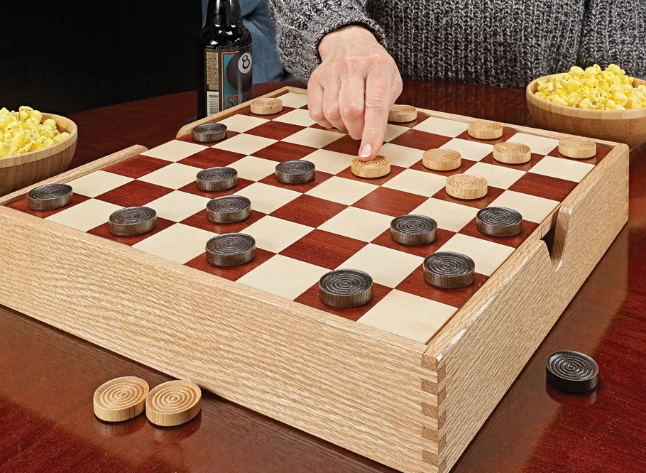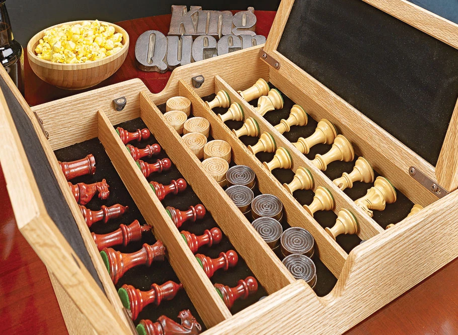 Outside of spending time in the shop, there’s nothing better than a game of chess with a friend or a couple rounds of checkers with the grandkids. This chessboard gives you the best of both worlds — a few interesting woodworking challenges, and a great excuse to play a few matches when you’re finished with the project. The unique feature of this chessboard is its go-anywhere design. The playing surface is actually a pair of lids that flip up to reveal a storage area for the game pieces. Magnetic catches hold the lids closed for travel. On the woodworking side, we’ll show you how to create the veneered game board and the eye-catching box joints. Game on.