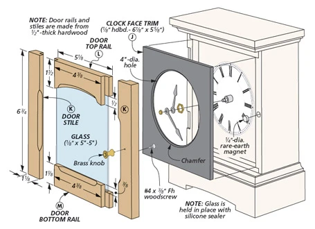 The art of making clocks was once limited to a very small group of highly specialized artisans. Cutting and assembling intricate gears and movements from exotic woods and metals was an activity left to only the most experienced craftsmen. Fortunately, woodworkers today have some significant advantages. We can order clockworks, hands, and faces in dozens of different styles. This clock is an excellent example. Its inexpensive quartz movement is far more accurate than most of its antique predecessors and far easier to install. We include details on where to find a movement you like and all the supplies you’ll need. But the best thing about making a clock is that it gives you a chance to work on small details. I find that this type of project is a great way to hone your woodworking skills.