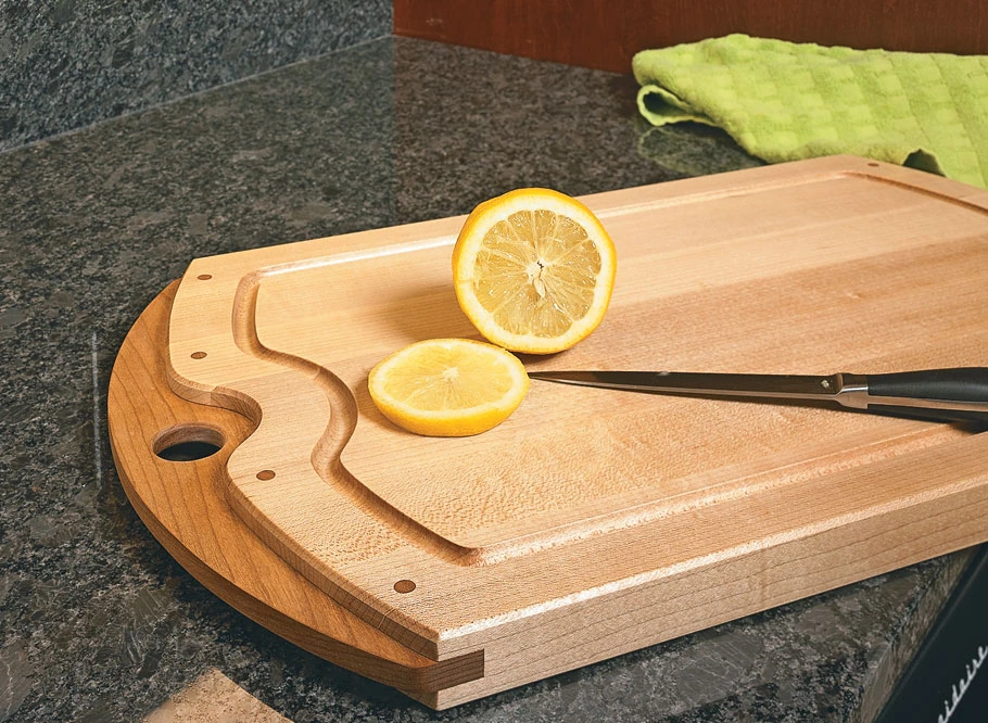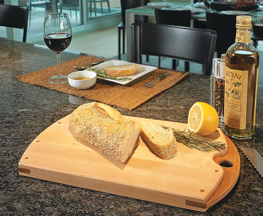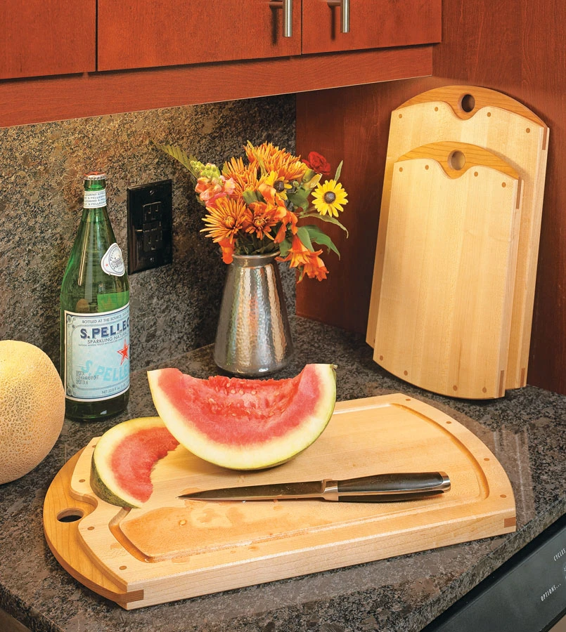 When it comes to choosing a material for cutting boards, it’s hard to beat wood. Natural wood has a charm and warmth that isn’t matched by other surfaces. Plus, wood doesn’t dull knives like some other materials. These three cutting boards are all made of edge-grain maple. Each one has a cherry handle with a finger hole, making them easy to move around and hang up when stored.