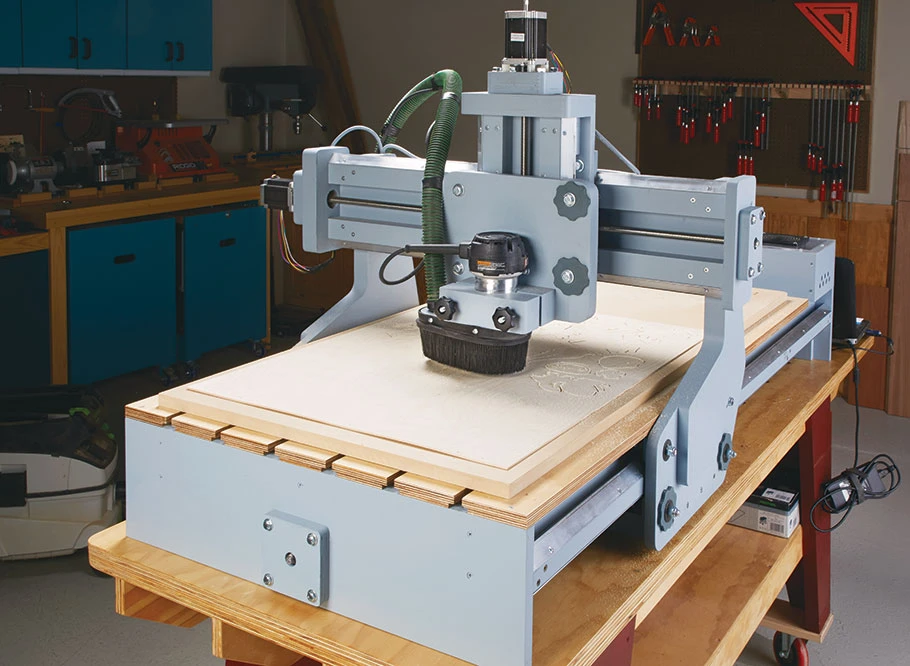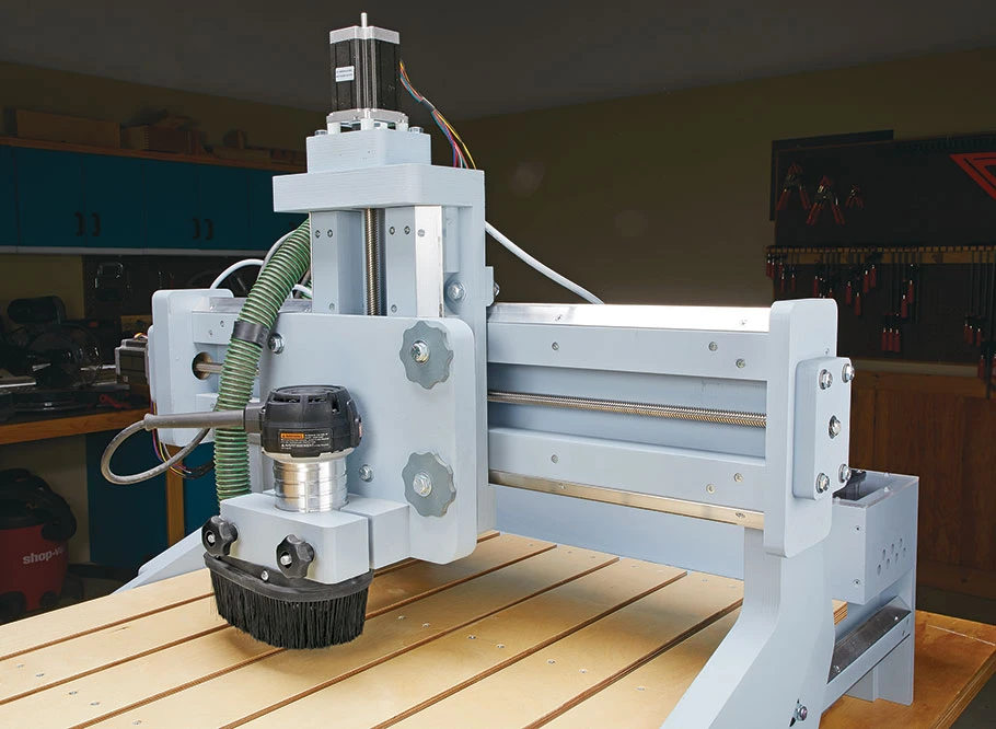 It’s a lot of bang for your buck. With a working area of 24″x48″, you can build this for a lot less than the cost of a similar commercial CNC router. Baltic birch plywood, some basic hardware, and an off-the-shelf electronics kit are all you need to build your own computer-controlled router. This project is ideal for tech-savvy woodworkers looking to add a CNC router to their shop or beginners who want to give this type of woodworking technology a try.