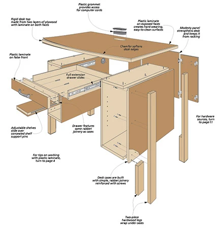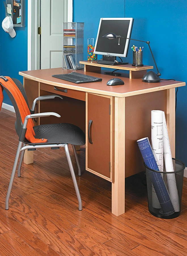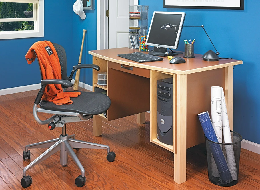 It seems that some of the best projects are the simplest to build. And that’s the case with this small desk. It’s about as clean and straightforward as possible. Part of what makes it so easy to build is the materials I used. Most of the desk is made from Baltic birch plywood. Unlike typical plywood, Baltic birch is made of many, thin layers that create a solid, void-free edge. Then for a dramatic touch, I covered most of the exposed plywood panels with plastic laminate. Besides adding color, the laminate is easy to clean and will stand up to years of use without a scratch.
