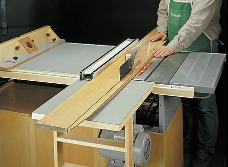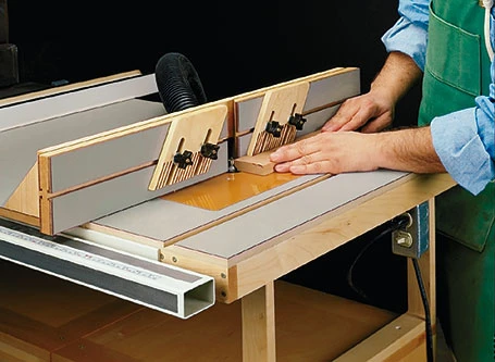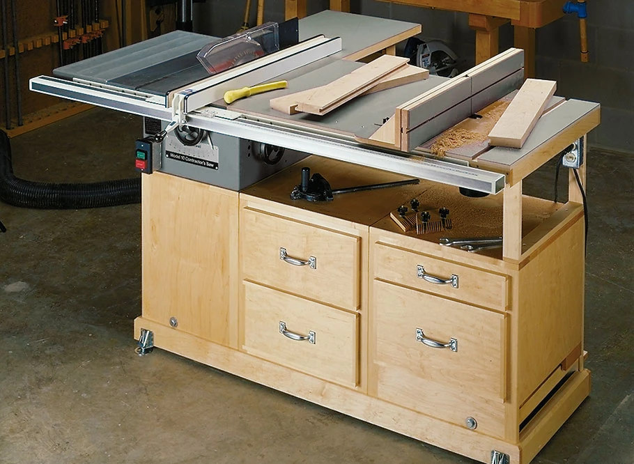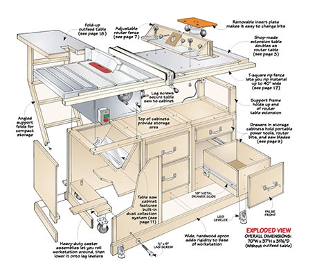 I’m always looking for ways to make improvements to my table saw. That’s why I’m so impressed with how this table saw workstation turned out. It started out simply enough. I installed a new T-square rip fence that was more accurate than my old fence and made it easy to rip large sheets of material. Well one thing soon led to another. Now the fence had the capacity to rip wide pieces. But I needed a large extension table to support them. So I built an extension table that attaches to the side of the saw. This table provided an ideal way to save some space in the shop. That’s because it doubles as a router table, see photo B. I even added an adjustable fence so I can use the router table and the table saw without having to “break down” either setup. (Plans for building the router table extension begin on page 8.) CABINETS. The table saw and router table are supported by three cabinets that are “ganged” together as a single unit. These cabinets provide storage, a built-in dust collection system, and a unique caster system that’s definitely worth a closer look. Finally, to “catch” a long workpiece as it comes off the saw table, I added an outfeed support that folds for storage.
