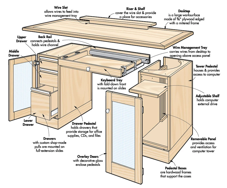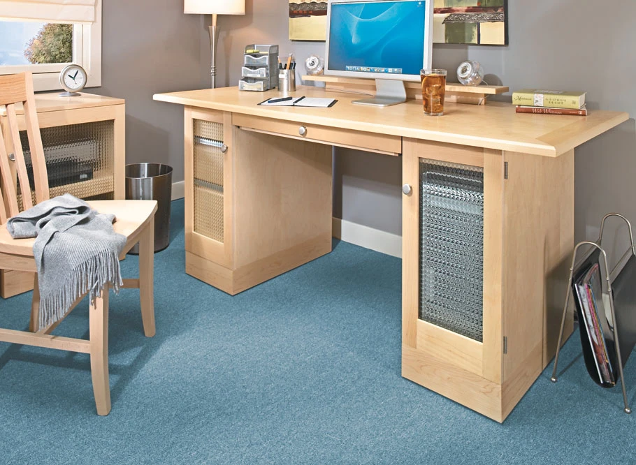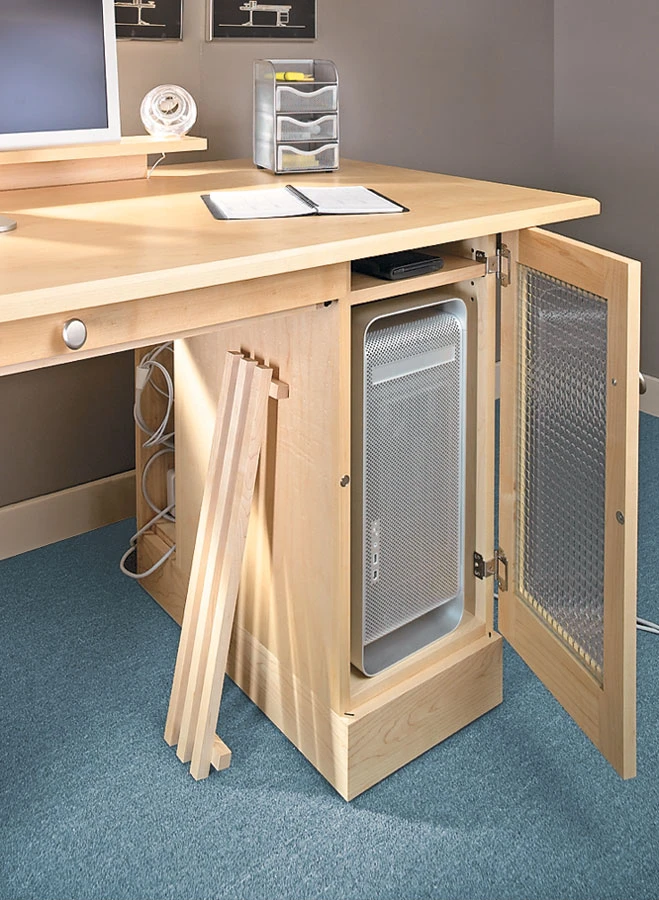 The heart of any home office is the computer desk. But what sets this desk apart from all others is that it’s designed to look great anywhere in the room — whether up against the wall or out in the middle of the floor. That’s the product of a unique wire management system built into the desk. On our desk, a riser and shelf conceal all the wires, which feed into a long slot in the desktop and into a wire management tray. From there, the wires are directed through an opening in the tower pedestal. A removable panel in this pedestal allows easy access to wires, and also provides good ventilation for the computer.