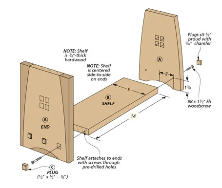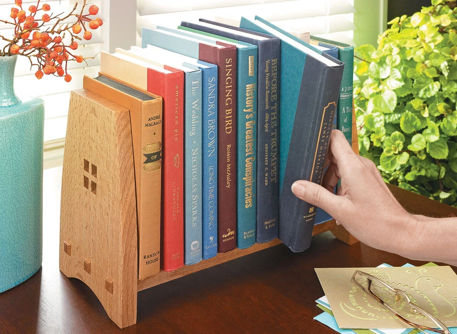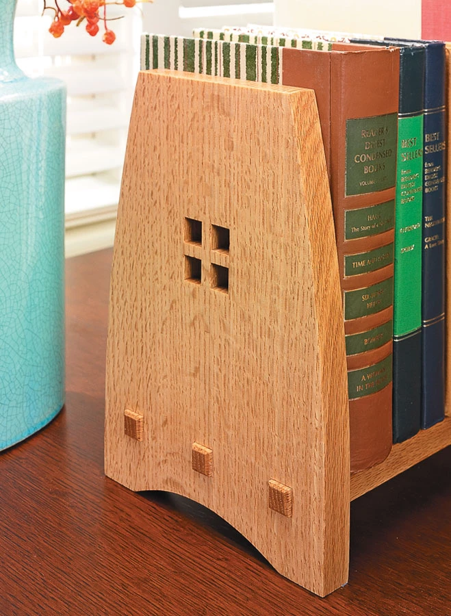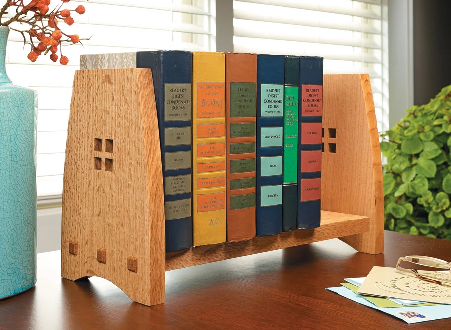 At first glance, there are a few things that make this small book rack really stand out. First, the decorative openings on the ends catch your eye. Then the joinery grabs your attention. Finally, the quartersawn white oak gives it a classic, solid look. There are only three main parts to this project — a shelf and two gently curved ends that include an arc on the bottom. As for the joinery, the shelf looks like it’s connected to the ends with through tenons. But these “tenons” hold a secret. They’re actually plugs over screws that connect the shelf to the ends. Along with the square openings, the plugs contribute to the Craftsman-style appearance of the book rack. And speaking of the openings, there’s a unique table saw technique for making these square holes that ensures they’re perfectly sized and centered with a minimum of hassle.