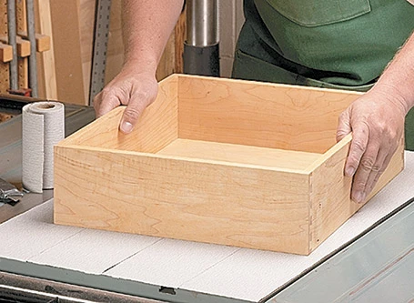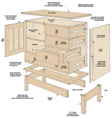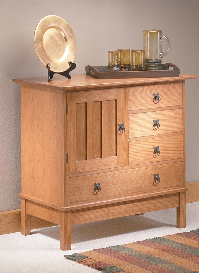 What is it about this cabinet that you notice first? The door with its two center stiles? The four drawers with their hammered ring pulls? Or possibly the straight, even grain of the oak case? For a relatively small project, there’s a lot of details to “take in.” And there’s a lot of woodworking here too. The case is plywood construction. The solid wood base it sits on is an open mortise and tenon assembly with a mitered frame. And the top is a large, glued-up panel. Add to this an inset door and four drawers, and you’ve got a wide variety of cabinet-making techniques — and challenges. If all this sounds a bit overwhelming, keep in mind that all these techniques are pretty straightforward. Take the case, for instance. Fitting a lot of case panels together while you’re adding glue and clamps can be a real juggling act. But that won’t be a problem here. When it’s time to assemble the project, all you have to do is work from the inside out, adding a piece or two at a time. And the relatively small size of the case also helps keep the assembly from being unmanageable. So you won’t need an extra set of hands to build this project. Or how about the drawers. They’re built with a halfblind dovetail router jig and are mounted in the case on full-extension metal slides. These slides work great (especially when the drawer is stuffed full), and they’re fairly easy to install. Still, by the time all four drawers were in place, I had a pretty good list of installation tips, and the five best are included.