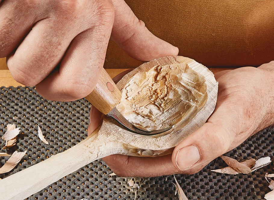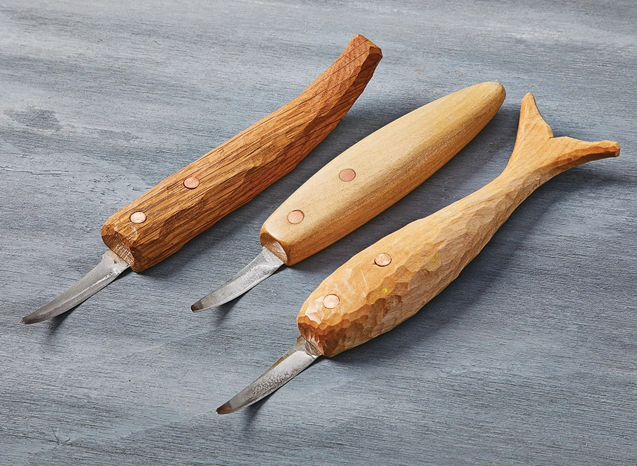 Our Creative Director, Chris Fitch, serves as both our resident carving expert and blacksmith, so this knife project quickly sparked his curiosity. There are really two mini projects inside each knife: making the curved blade and then the handle. Chris found a simple blademaking solution for those of us who don’t have a full blacksmith shop. The wood handle offers up some solid carving practice on its own. There are three handle patterns shown here that you can choose from. The key is to spend a little time whittling, filing, or sanding the handle to suit your hand and comfort.