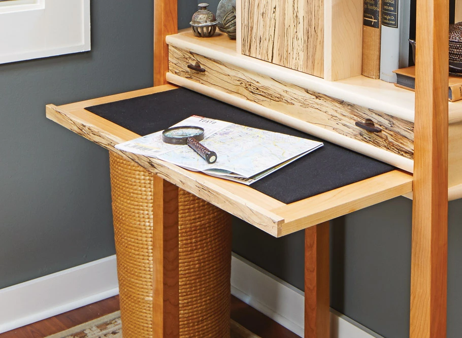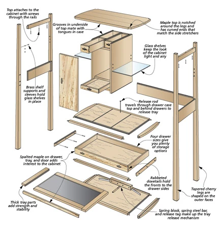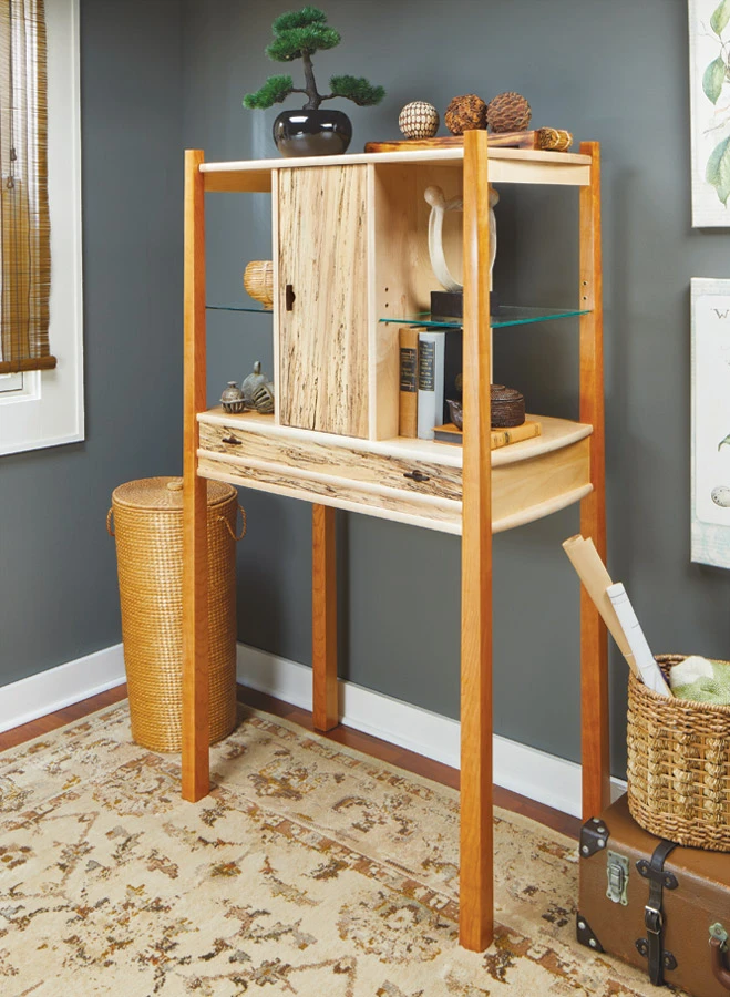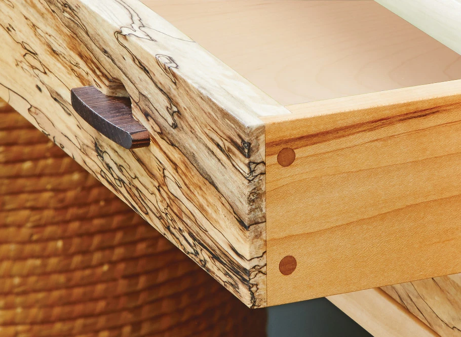 Displaying our family treasures has never been more of a joy since the addition of this cabinet to our living room. Its size and profile are easy on the eyes and could occupy any space in your house with quiet confidence. The cabinet is made of a trio of hardwoods that work perfectly with each other. Four long, slender, but strong tapered cherry legs anchor the maple case. As you see here, front and center is spalted maple for the drawer fronts and doors to add another layer of interest. Starting with the drawer case, a large drawer provides some generous storage. There’s also a felt-lined tray that offers a place to review and examine the items you wish to display. Inside the main case, there’s a quartet of drawers that give you a pleasant range of options for hiding away family treasures. The dessert for this well-rounded woodworking meal is some custom-made pulls that fit into a socket routed into the drawer front. With all this in mind, let’s roll up our sleeves and jump to it!