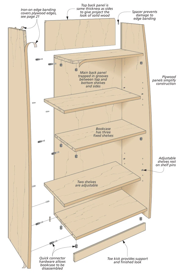 As much as I enjoy a challenge, I have to admit that every now and then it’s nice to build a simple, straightforward project. And with it’s clean lines and basic design, that’s exactly what this bookcase is. The construction is also straight – forward. It uses quick-connect fasteners, so there’s no complicated joinery to deal with. And it’s made almost entirely out of plywood, so you don’t have to spend a lot of time gluing up solid-wood panels. But in spite of its simplicity, this project will still throw you a curve — two curves, in fact. If you take a look at the photo, you’ll see that the sides of the bookcase have a grace – ful curve along the front edge.