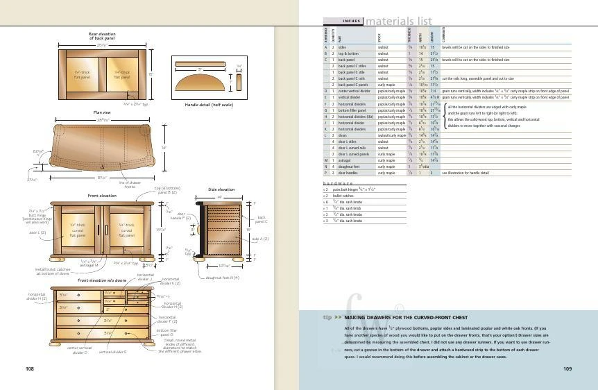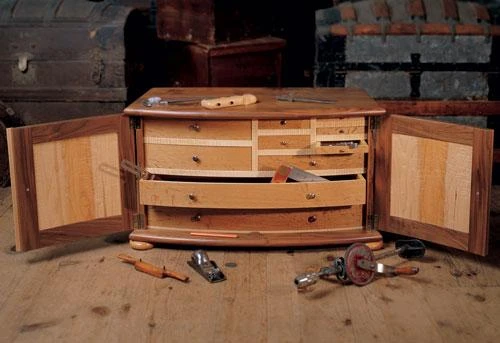 What makes this chest so attractive is the curved front and the round edges that soften its look and feel. We used walnut and curly maple to make it irresistible. Plan includes detailed view of chest, materials list (including hardware), step-by-step instructions, and full-color photographs. From Building the Perfect Tool Chest by Jim Stack.
