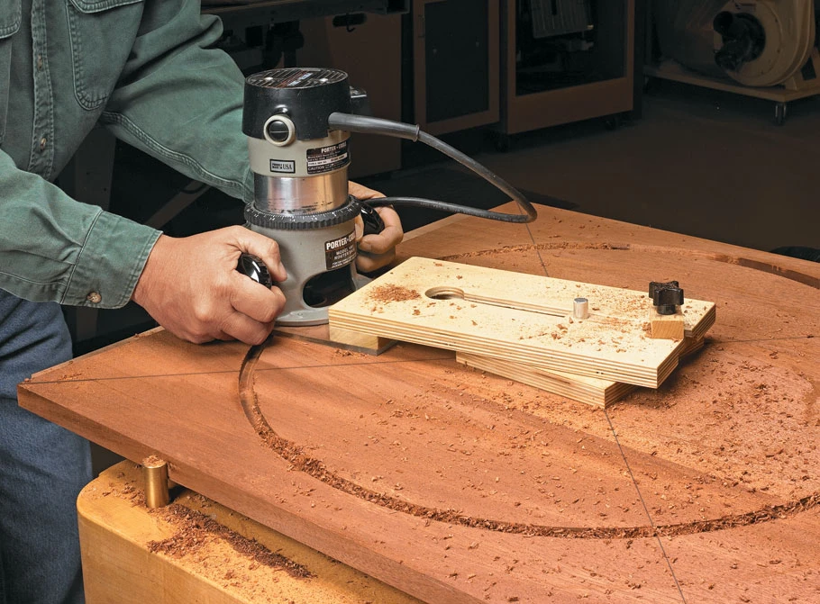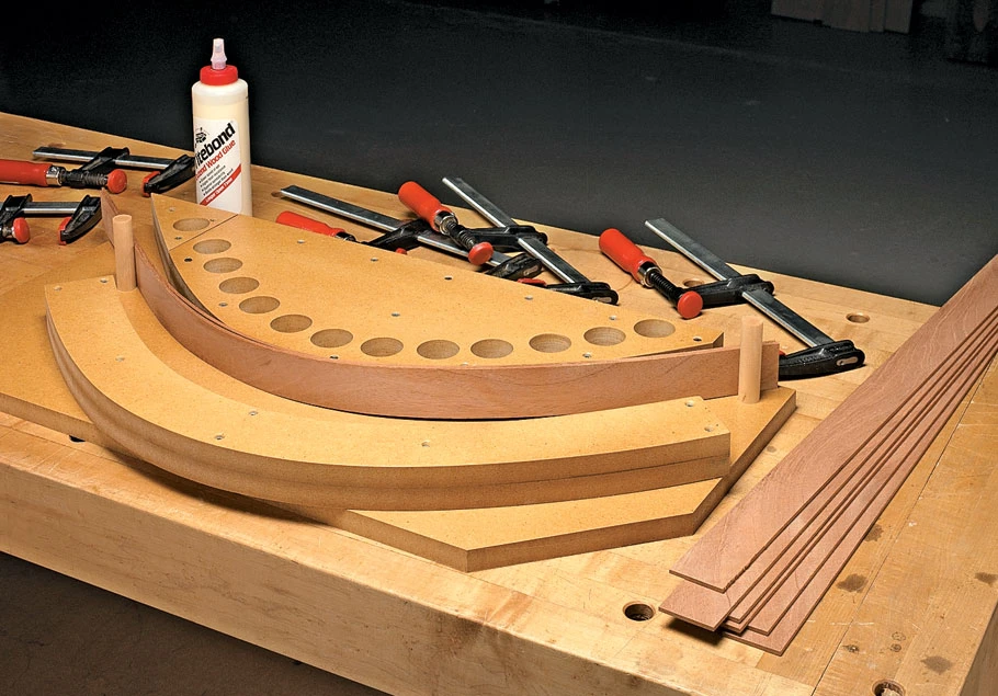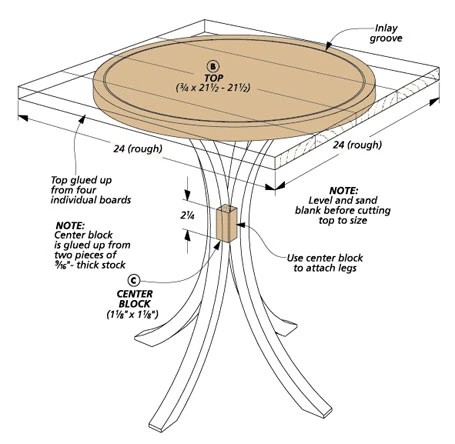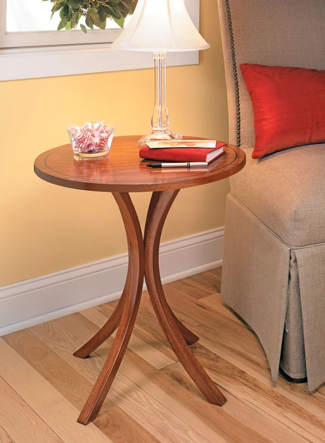 There are a couple of things about this table that catch your eye right away – the sweeping curve of the legs and the decorative, circular inlay in the round top. The legs are actually made up of thin layers, bent in a curve and glued together. The decorative inlay on the top is not wood but colored epoxy. This creates a great effect without the hassle of fitting inlay pieces. With the help of this plan you will master both of these techniques.