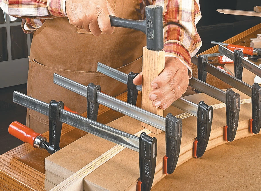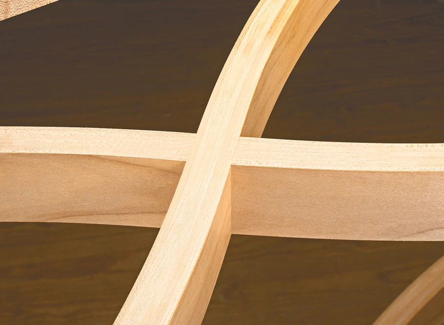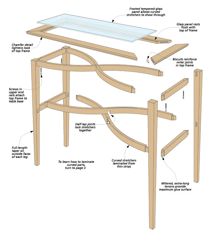 Most of the woodworking projects I build have parts that are straight, flat, and square. But every so often, it’s nice to break out of the box and throw in a few curves. That’s just what this accent table is all about — curved stretchers. Getting pieces of solid wood to bend like this may seem impossible or at least complicated. But don’t worry. It turns out to be a simple process that doesn’t require any special tools or materials. The trick is that although they look like a single board, they’re not. To get the wood to bend, each stretcher is cut down into thin, flexible strips. These strips are then coated with glue, wrapped around an S-shaped form, and clamped. The result is smoothly curved parts. With a little clean up, they’re ready to use.