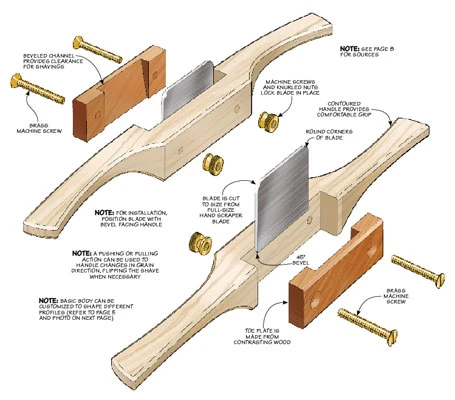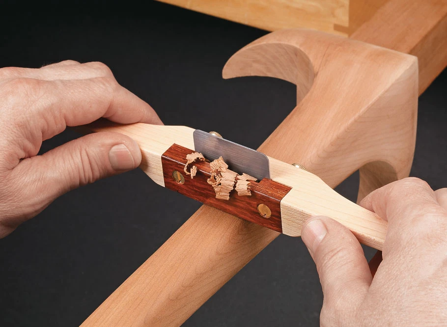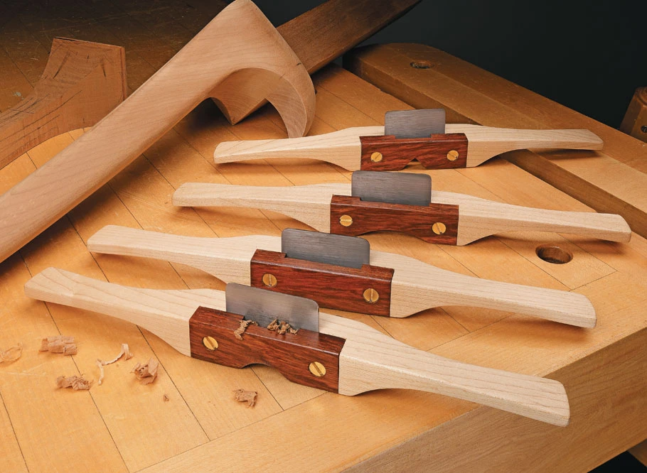 Removing marks and ridges left over from machining and hand tool shaping can be a challenge. For many of these types of tasks, we turn to a scraper shave. This unique hand tool makes cleaning up and smoothing oddly shaped workpieces a pleasure. The gently curved handles are cut on a band saw and shaped to fit your hand. Using the shaves produces a smooth, clean workpiece, even when working with figured wood. The four versions include a flat-bottomed shave, as well as two radius shaves designed especially for shaping round or curved pieces. You’ll also find plans for a notched shave that’s great for adding and smoothing chamfers.