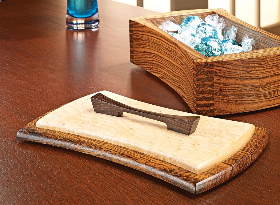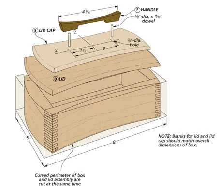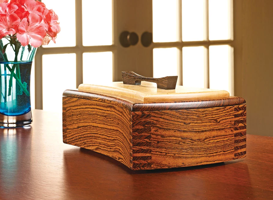 This beautiful keepsake box makes a great gift. Because it’s so small, it’s easy to splurge on highly figured or exotic wood without spending a fortune. The curved sides and ends add an interesting design element, too. And it’s crafted with a snug-fitting capped lid. But perhaps the most interesting feature is the intricate-looking finger joints connecting the corners of the box. They appear wider on the ends than on the sides, but in reality, they’re formed at the table saw while the box is square. The curved, profile cuts made later create this unique, asymmetrical illusion. The box may appear complicated to build, but the construction is pretty straightforward.