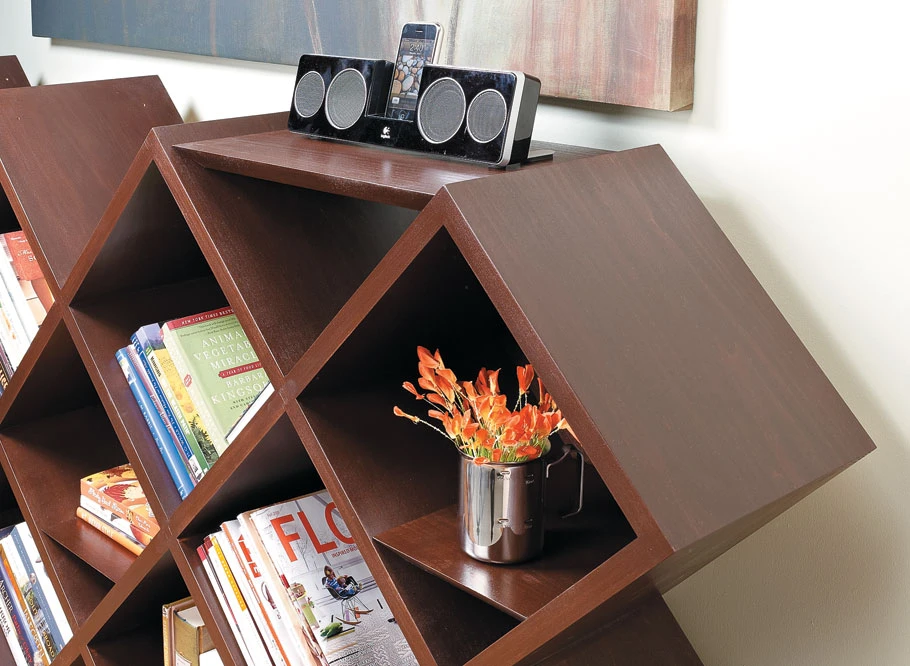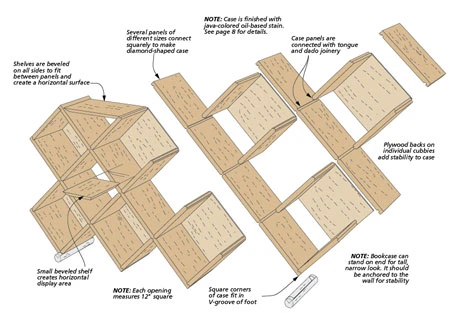This bookcase has plenty of room to display books or other treasures and do it with great style. It’s designed so that it can sit either horizontally or vertically to conform perfectly to your space. All you need to do is change the location of the feet. Although the case looks like a series of diamonds assembled by connecting square boxes, it’s really built from a series of panels. The panels are joined with tongue and dado joinery that come together to form diamond-shaped openings. Some of the openings, or “cubbies,” have back panels to add stability to the case. Plus, you can add beveled shelves in the openings and across the top to create different storage options.