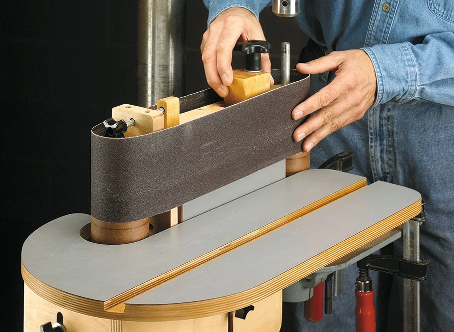 Sanding is one of those tasks that few people enjoy. So any time you can speed up the job, so much the better. The trouble is that stationary belt sanders take up a lot of shop space. And they can be rather expensive. But with the drill press belt sander, you can enjoy all the benefits of a large, stationary sander without having to invest in a new piece of equipment or give up valuable shop space. What’s unique about this belt sander is that it’s powered by another tool that you probably already have in your shop — a drill press. The sander is simply clamped to the table of the drill press. Then a shaft on top of the sander is chucked up in the drill press — just like a drill bit. With a flip of the drill press switch, the sanding belt takes off and you’re ready to start sanding.