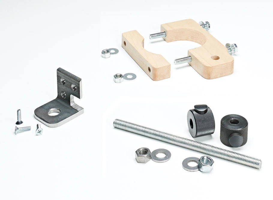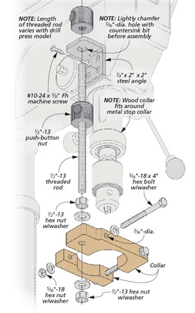 The depth stop on some drill presses seems like an afterthought. Setting it can be a fussy operation. That’s where the upgrade you see here really shines. Plus, it adds the ability to lock the quill at any height. First, a steel bracket mounts to the side of the drill press. A wood collar fits around the quill’s metal collar. Attached to the wood collar is a threaded rod that passes through the bracket for adjusting the quill position and push-button nuts act as stops on the rod.
