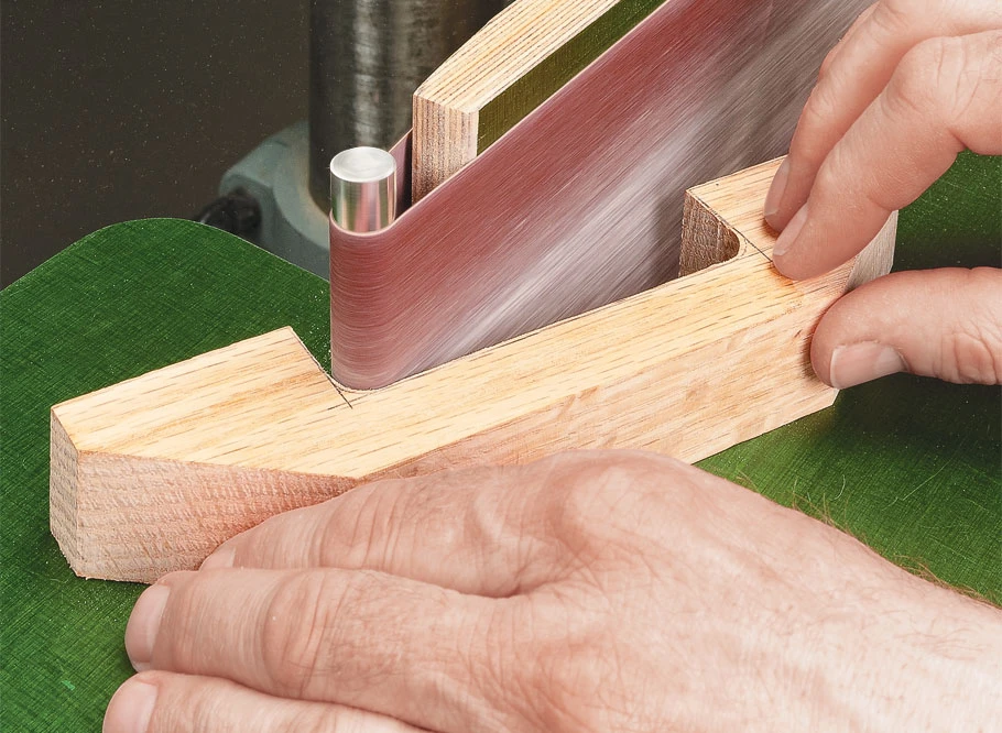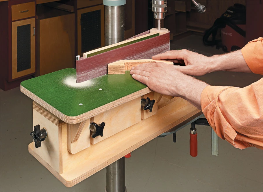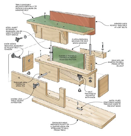 A full-size, dedicated edge sander is one of those tools that would be nice to have — if you have the space. As an alternative, we built the portable edge sander you see above. It’s a scaled-down version of a big, commercial unit with several advantages. First, it’s powered by your drill press. Since there’s no motor, it’s easier to store when it’s not being used. Plus, it uses a common 4″ x 36″ sanding belt. The long, wide platen provides support for smoothing straight edges and outside curves. Inexpensive hardware, including ball bearings, makes it a smooth-running, quiet machine. And the best part is, you’ll find that building the sander is just as enjoyable as using it afterward.