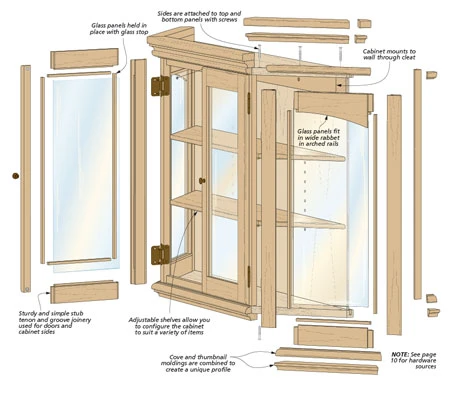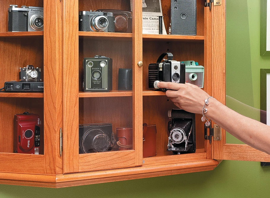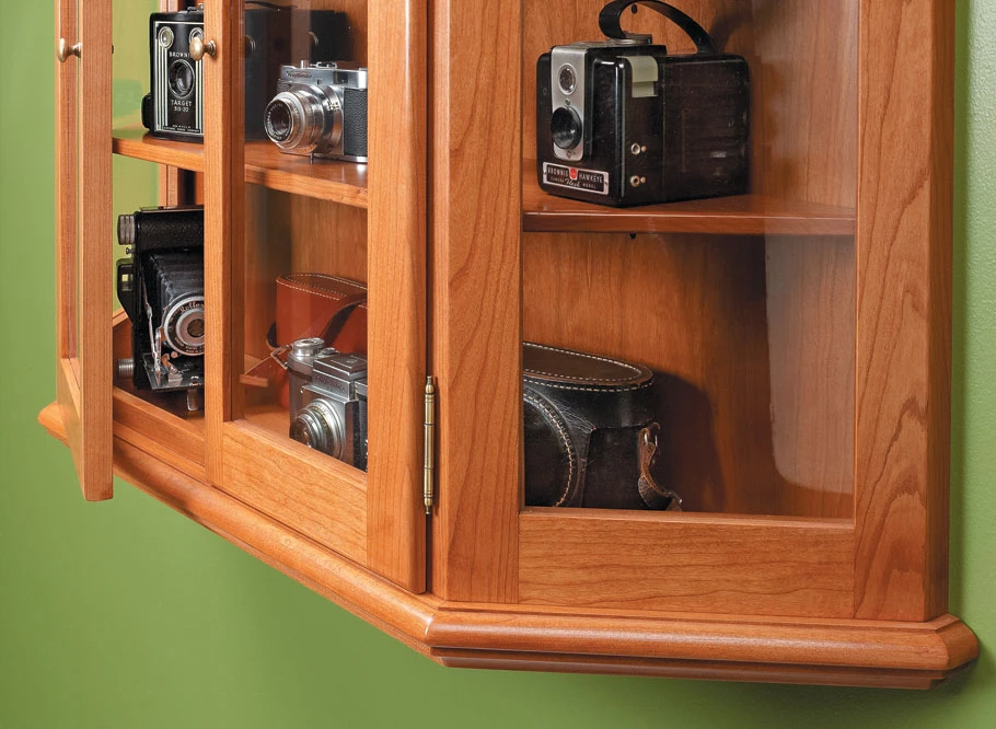 An eye-catching curio cabinet, like the one shown above, offers a versatile way to spice up any room. Whether you use it to display a few special collectibles or simply some books and knickknacks, it’s sure to become the focus of the room. Its construction combines several straightforward shop techniques to create a piece that’s great-looking but easy to build. From the built-up shop-made moldings on the top and bottom to the frame and panel doors, there’s nothing here that’s too difficult or requires any special tools.