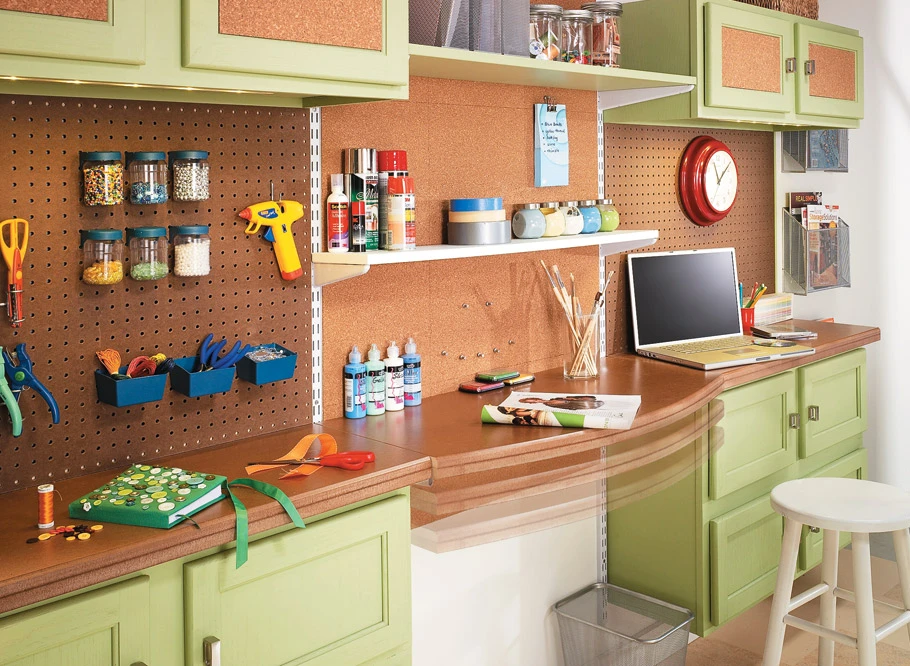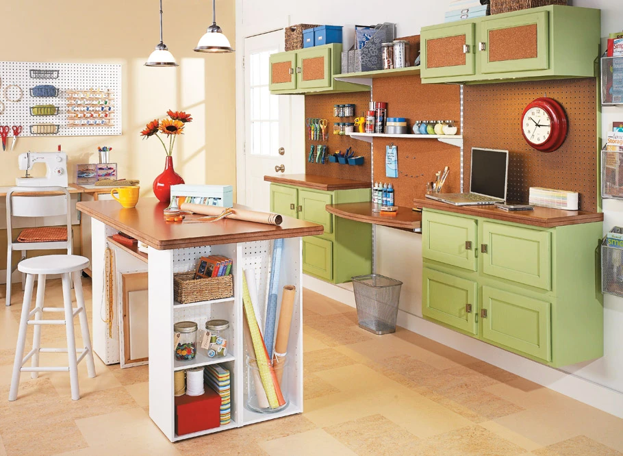 A family’s crafts and hobbies can take up a substantial amount of space in the home. Whether family members spend their time sewing, building models, scrapbooking, or doing homework, they all need some room to spread out. Those activities are often relegated to the dining room table or the desk in a home office, which isn’t a problem — until the spaces are needed for something else. Then it’s a hassle to move all of the supplies and find a place to store them. When juggling storage and hobby work stations becomes an issue for your family, this activity room is the perfect solution. It eliminates the problem of finding space for everyone’s hobbies and keeps supplies from cluttering other areas.
