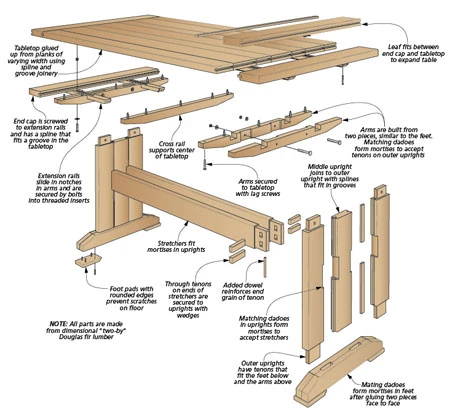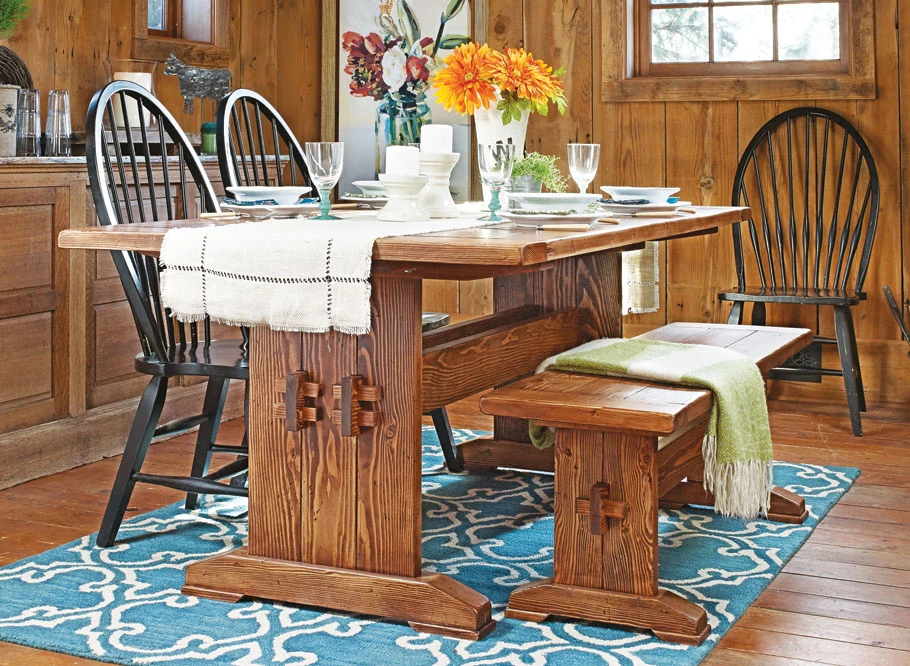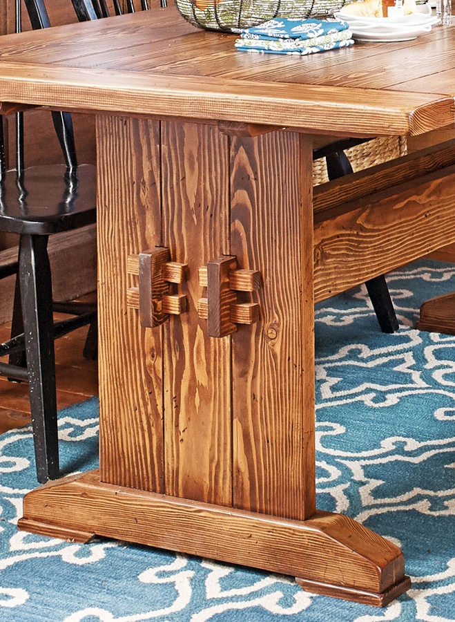 In today’s world, many families are more comfortable having dinner in a casual setting, and this farmhouse table is the perfect spot. It’s a unique look that offers a nice alternative to traditional, high-class dining room furniture. Though the look is casual, this table still has a lot to offer. With its thick Douglas fir planks, a distressed finish, and sturdy mortise and tenon joinery, the table is certainly not lacking in style. And the trestle design of the table, with a wide base assembly that connects to the top, is a timeless look that’s sure to please its users for years to come. There’s also a matching bench that’s essentially a smaller version of the table. You’ll find complete plans for the bench included.