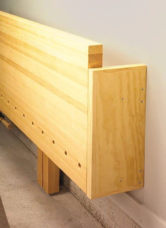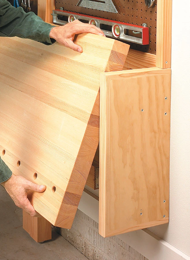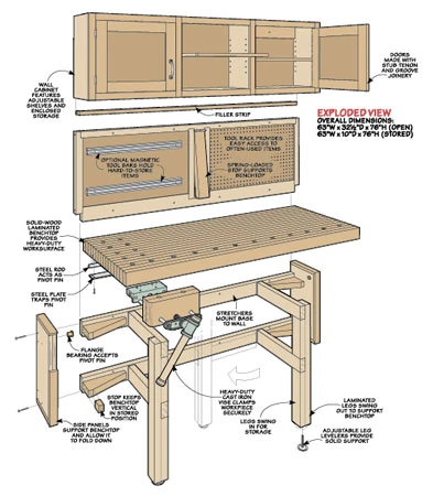 A solid wood, laminated benchtop and swing-out legs form the heart of the workbench. Wall-mounted tool rack and storage cabinets keep your tools organized and within easy reach from the bench. A bolt-on cast iron vise adds clamping capability to the workbench, and a set of dog holes in the top offer even more clamping options. It’s a solid, versatile tool, and with the top folded down, the workbench takes up very little space in your garage or shop. Plans for an alternate top made of three layers of plywood with a hardboard work surface are included.