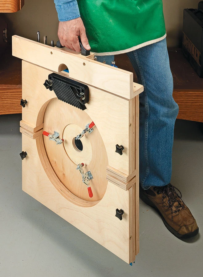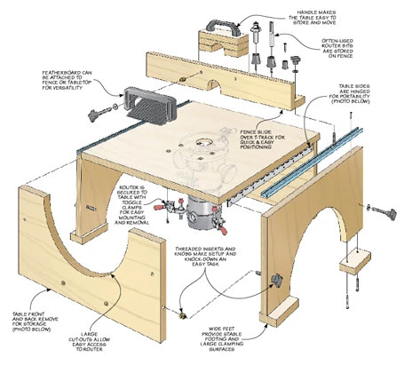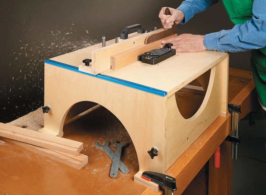A full-sized, permanent router table setup might be a great solution — if you have the space. But if you only use a router table occasionally, or you need a mobile solution, this could be the answer. This benchtop tool features all the accuracy and stability you’d expect from a full-size router table. And when it’s time to store the table or take it to a job site, just remove the router, fold up the table, and it’s ready to go. This quick transformation is possible due to a unique design and readily available hardware. The sides of the table are hinged to fold like a book. The front and back are then fastened in place with threaded knobs. Finally, the fence detaches from the top to become the handle for transporting and storing the table.