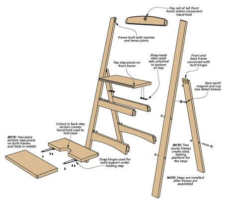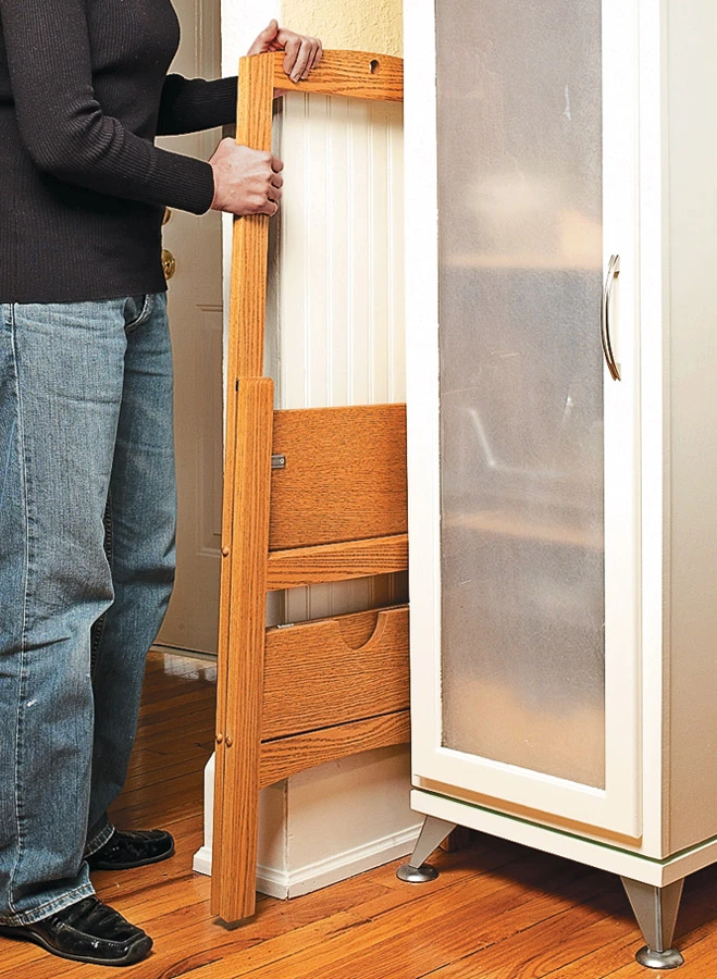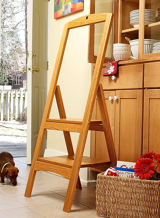 When set up, this step stool is solid as a rock. The upper rail of the tall front frame provides a convenient hand-hold to steady yourself as you step up to reach for the item you’re after. Once you’re safely back to floor level, the stool can be quickly and easily folded into a compact profile to store in a handy location. The clincher is that the stool goes together in a snap. There are no tricky “mechanics” to deal with. Solid, straightforward joinery and some common hardware are the basic ingredients. And we guarantee this useful project will earn its keep for years to come.