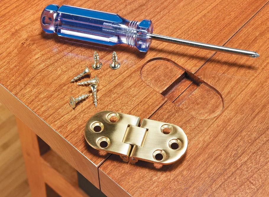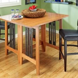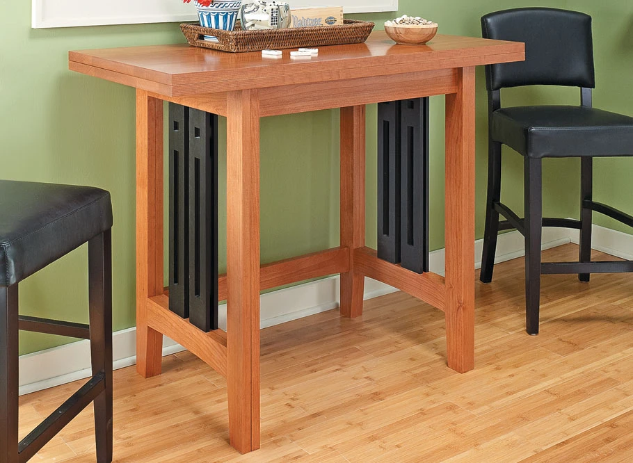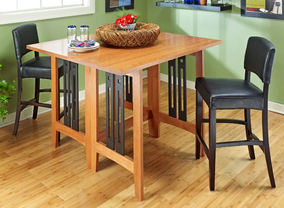 A folding table is a versatile way to make the most of limited space in a kitchen or dining room. It can double as a work table in the kitchen or a handy place to grab a snack. When it’s time for dinner or company, this counter-height table folds out to create extra room for family and friends. The decorative panels in the end frames complement the Craftsman-style design. We took the difficulty out of creating the openings in the panels by making them three-piece glueups. The table’s ability to double in size is accomplished by a pair of hinged-end frames that swing out to support the hinged top. When the table is folded, the end frames store flat against the table base.