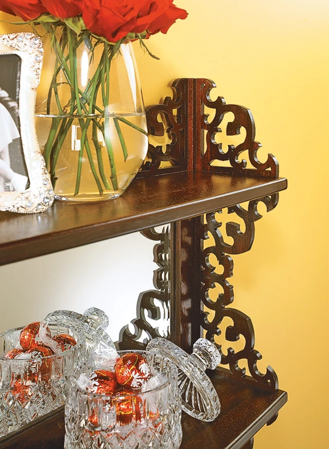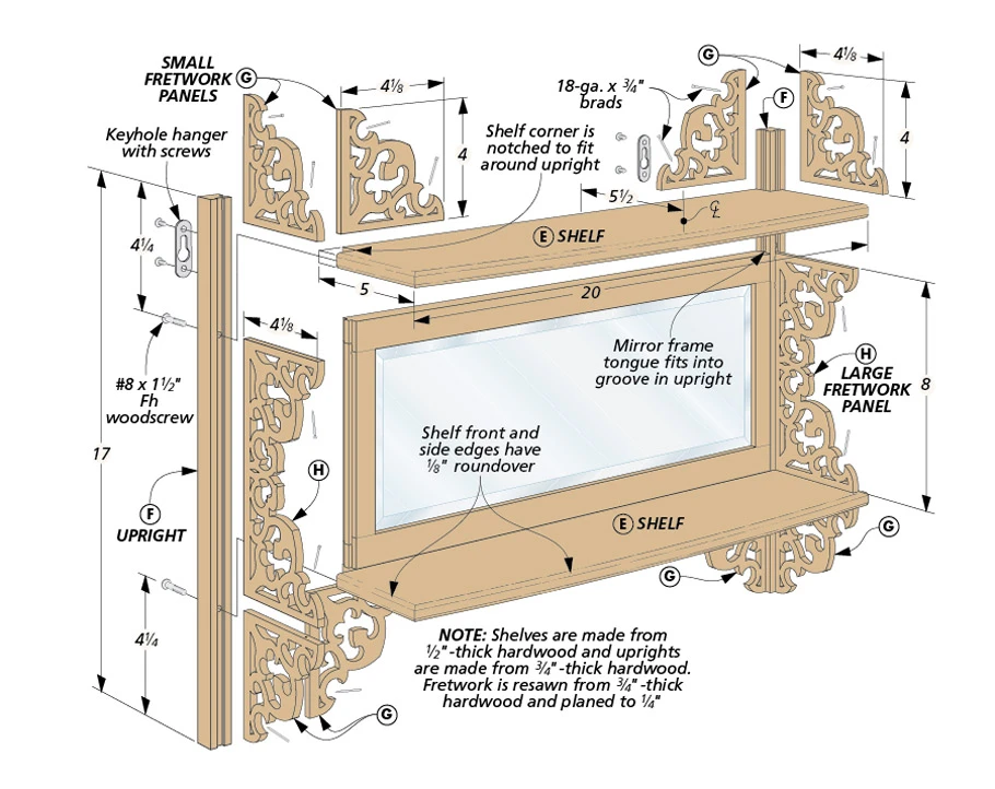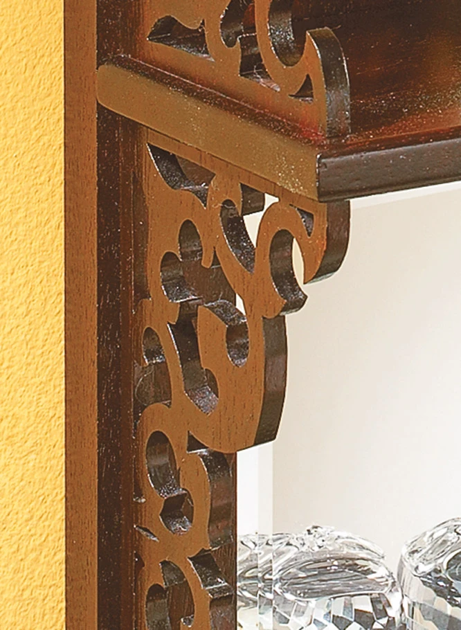 Sometimes, it’s nice to take a break from the typical woodworking routine and do something different. And this scroll saw project does just that.The intricate cuts and change of pace can be very relaxing. But, you also want to end up with something you can be proud of — something a little out of the ordinary that can be displayed. The shelf you see here fits the bill in every way. It’s simply a mirrored frame wrapped with a pair of shelves and uprights. Of course, what really makes this project stand out is the fretwork. It may look daunting at first, but you’ll find out that cutting fretwork doesn’t take much time, and it’s simple to create decorative motifs. This plan will take you step-by-step through the procedure and patterns used for making it.