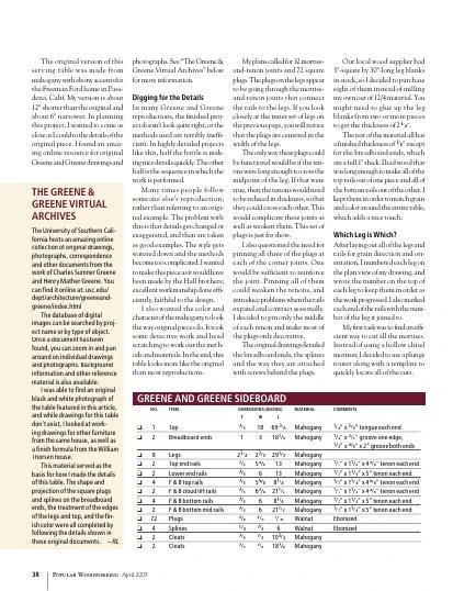 You’ll learn how to create some of the style’s most recognizable features like cloud lifts, square pegs and rounded breadboard ends. This article, with detailed illustrations and step-by-step instructions, is based on original Greene and Greene drawings.