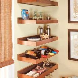 If you’re looking for shelving that’s attractive and space-saving, then this project will fit nicely in your home. The four-sided shelves hang securely to the wall with hidden brackets. Plus, the low-profile shelves can be grouped, so you can hang several together without taking up valuable floor space. And the shelves are easily modified to store bottles of wine or wine glasses. With these shelves, just a few feet of wall space could be converted into a mini wine bar to serve you and your guests. Splined miters join the front corners, while tongue and dado joints hold the back. If the clean lines of these shelves don’t suit your decor, two additional styles for the shelves are included.