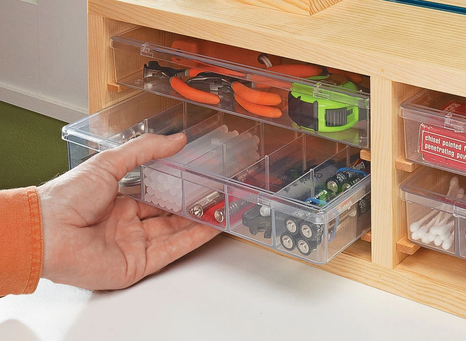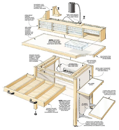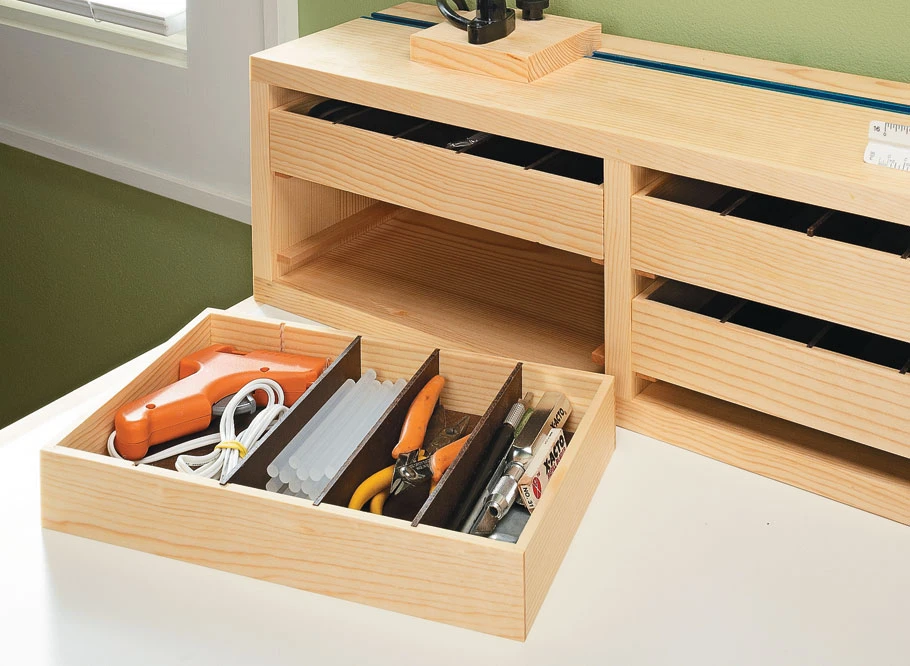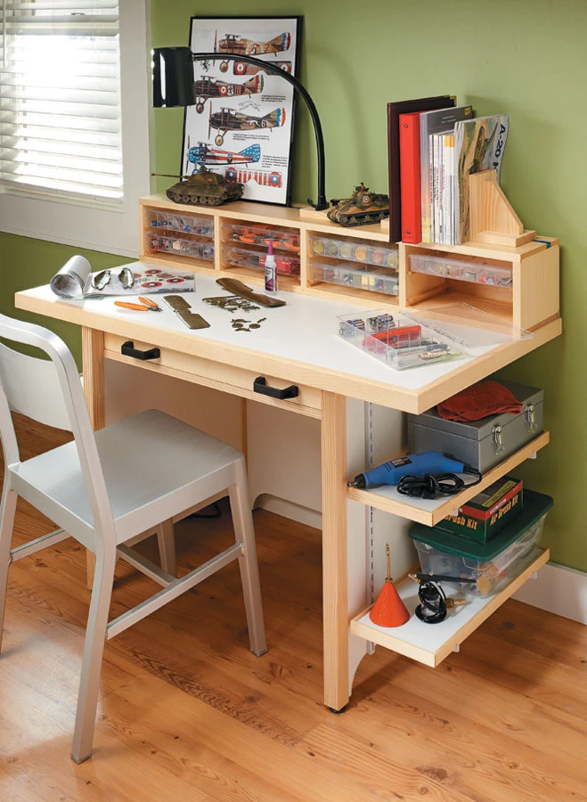 Most workbenches are great for building furniture. But, they’re often too large for smaller hobby activities. Plus, they often lack storage for large and small items. The small size of this Hobby Bench allows you to put it anywhere, but it features a lot of storage options, like the open-front cabinet. The cabinet holds eight storage bins that are ideal for organizing small parts. The bench also has a few other handy features like a built-in lamp and adjustable bookends.