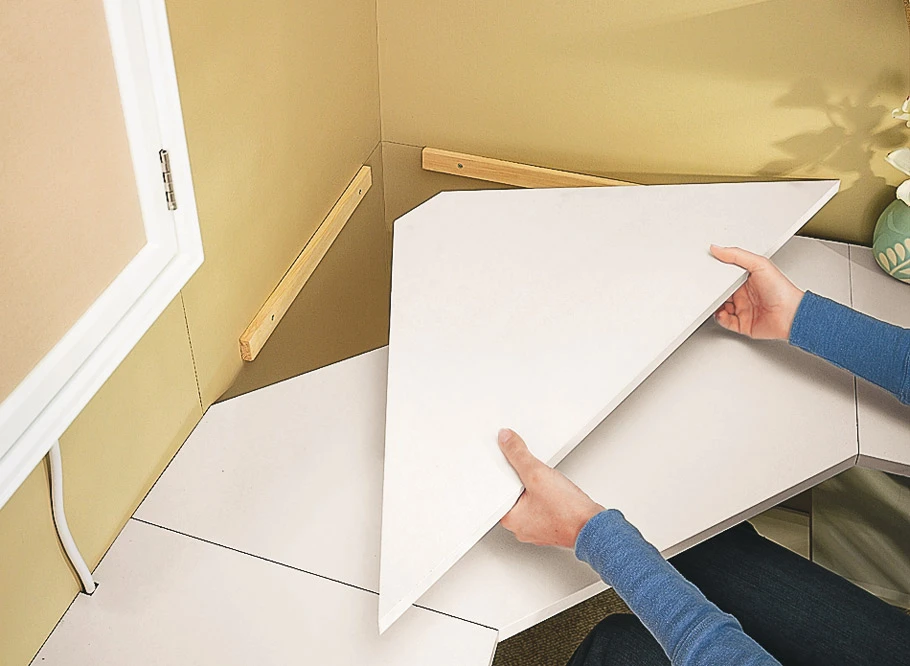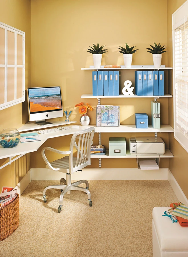 To make this room into more than just an office, we also incorporated a complete craft center on the wall opposite the desk. It offers a big work surface and lots of storage, but still fits the confines of any compact basement office space.