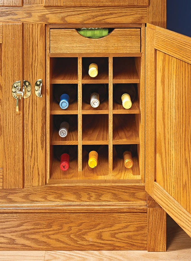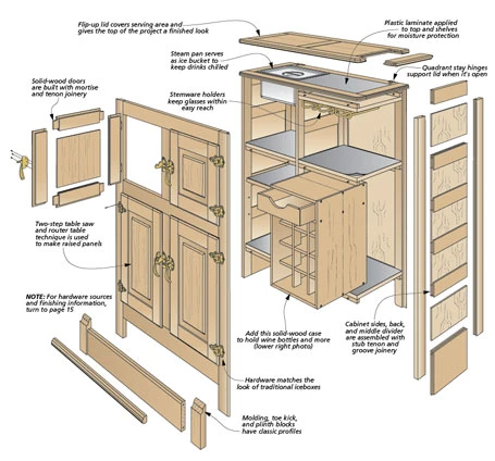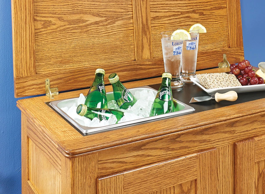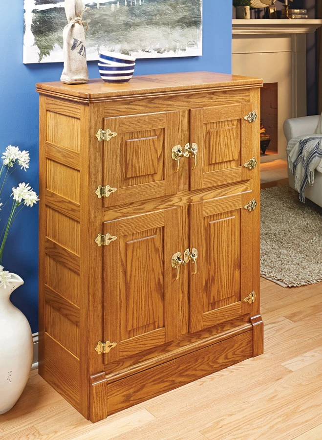 While the original function of an icebox may be obsolete, one look at the photo shows that the look is still fresh. This cabinet is based on an older design, but it has a new job — as a serving station. Inside are four storage compartments for storing beverages, glasses, and supplies. A flip-up lid conceals an ice bucket and laminate-covered serving area. You’ll find plenty of enjoyment in building this icebox, too. Like the styling, the construction is all traditional. We used red oak throughout. The case, doors, and lid feature stub tenon and groove as well as mortise and tenon joinery. Even the finish is meant to evoke a well-used antique. Once it’s complete, sit back and enjoy the result of your efforts with a cold, refreshing drink.