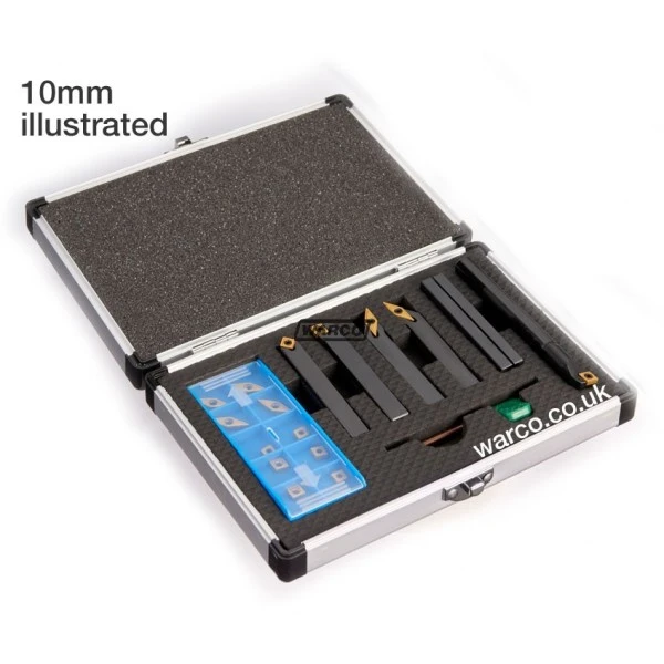 | 9682 | 10mm set Lathe tools – 10 x 70mm Boring bar – 9 x 100mm Clamp – 13mm | SVJCR, SVJCL, SCLCR, SSDCN, SCLCR | 4PC Insert VCMT110204 4PC Insert CCMT060204 2PC Insert SCMT060204 | 9681A |